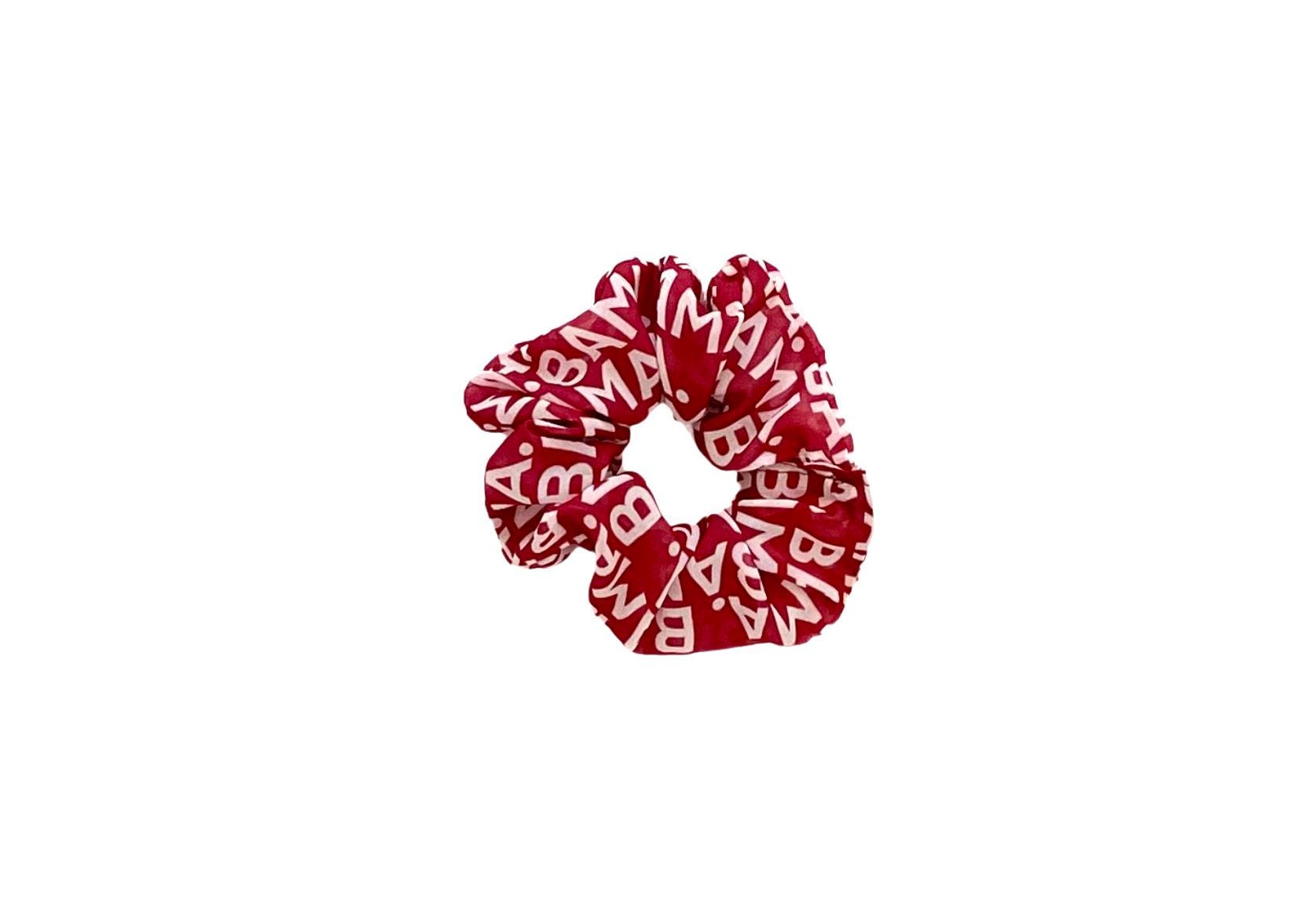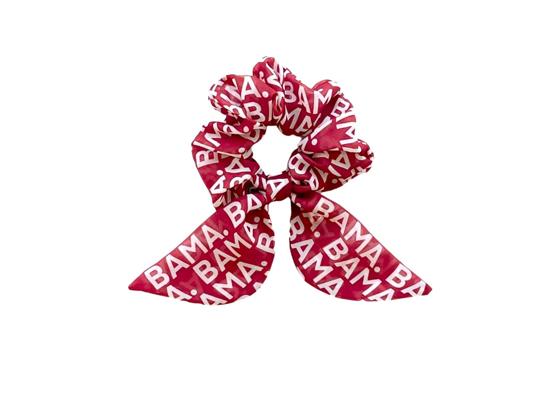 A pattern with the nickname BAMA for the University of Alabama. White lettering is on a crimson background and is made in a chiffon silk fabric. This is a lightweight and airy scrunchie.