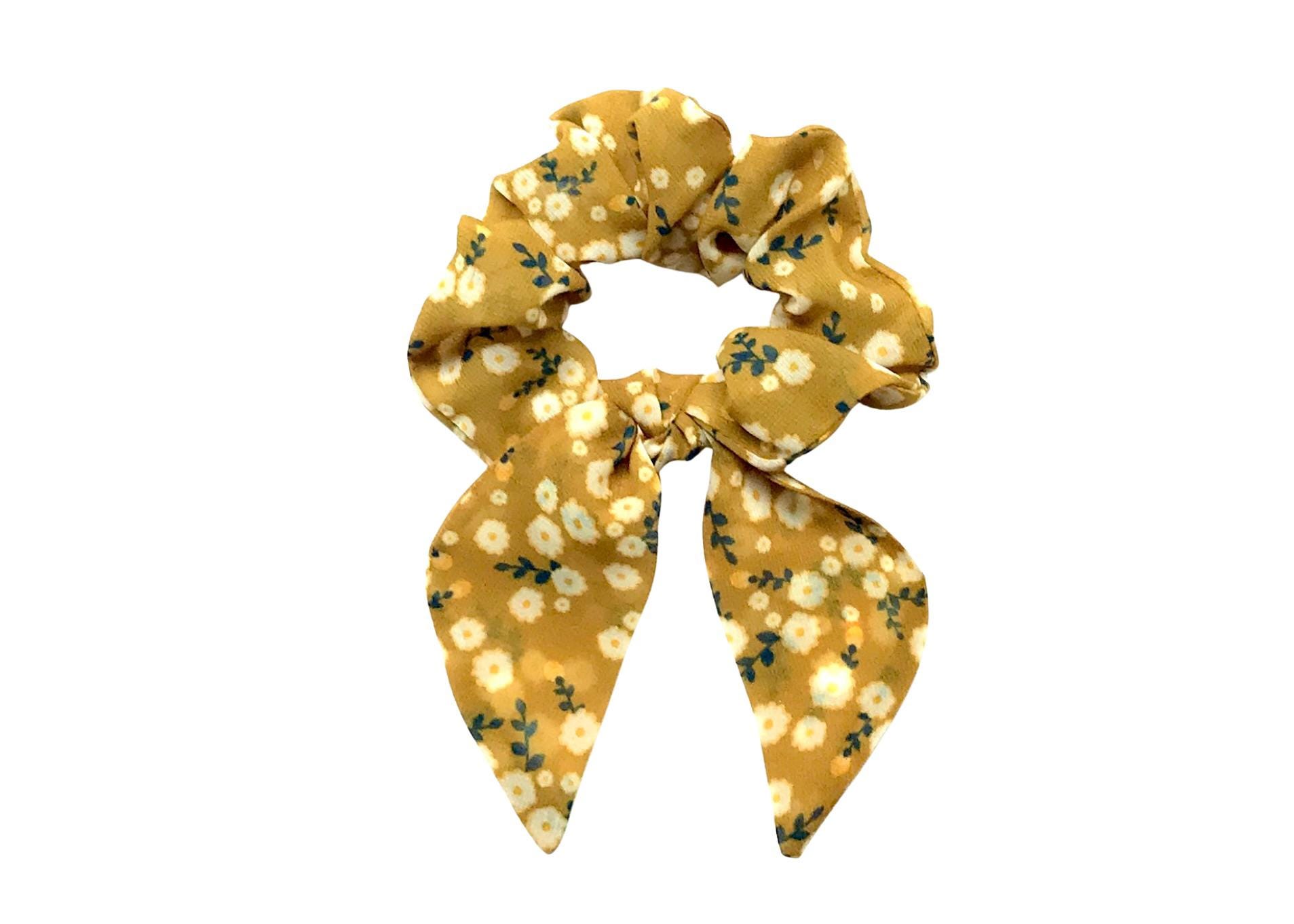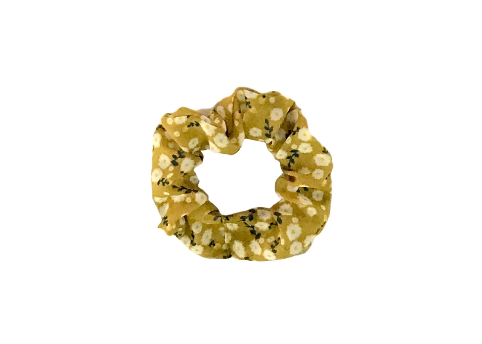 This scrunchie's print has petite flowers and leaves in the colors of cream and green set on a mustard yellow background.