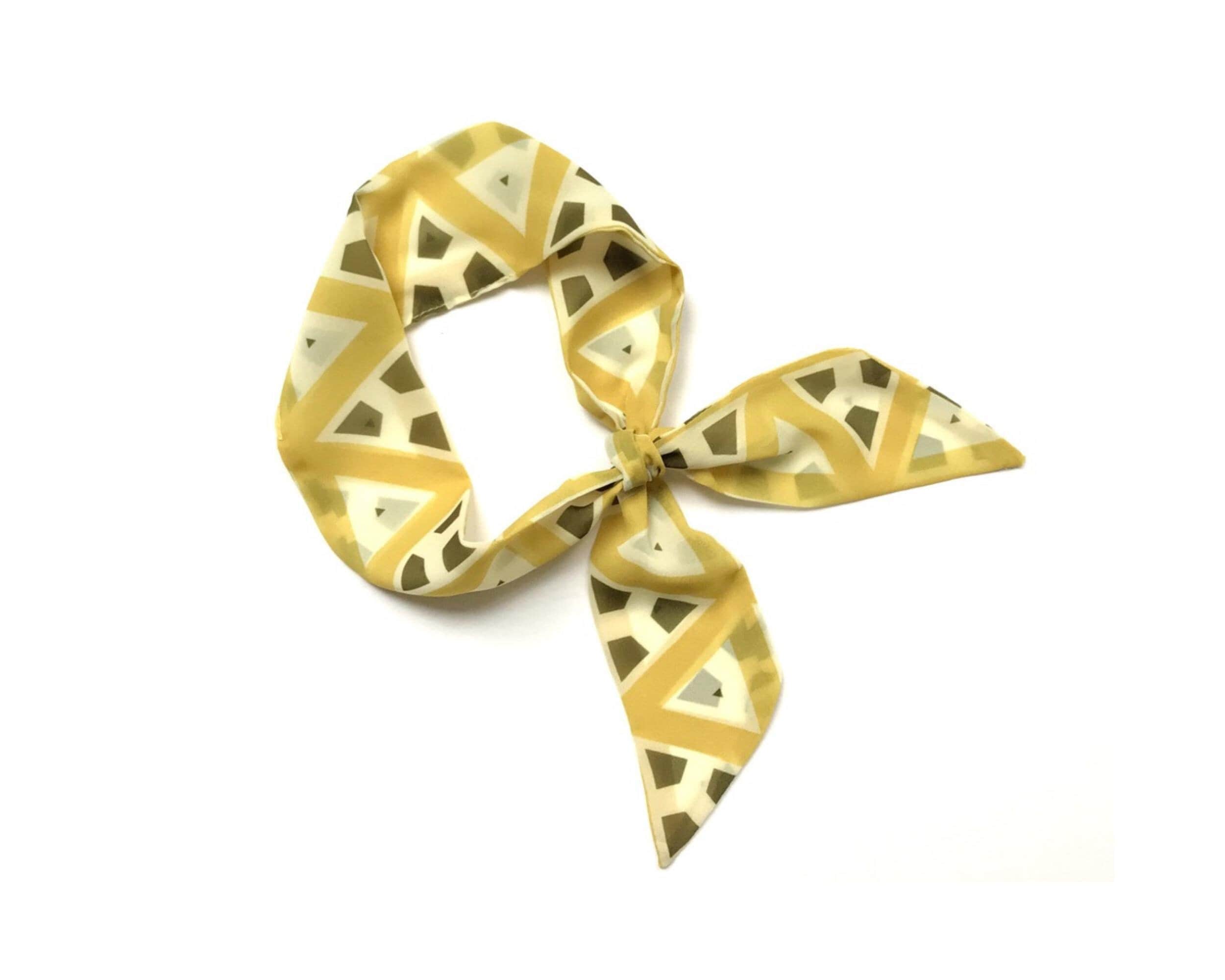 This scarf is a geometric pattern of cream and olive green triangles. The triangles are set on a mustard yellow background.