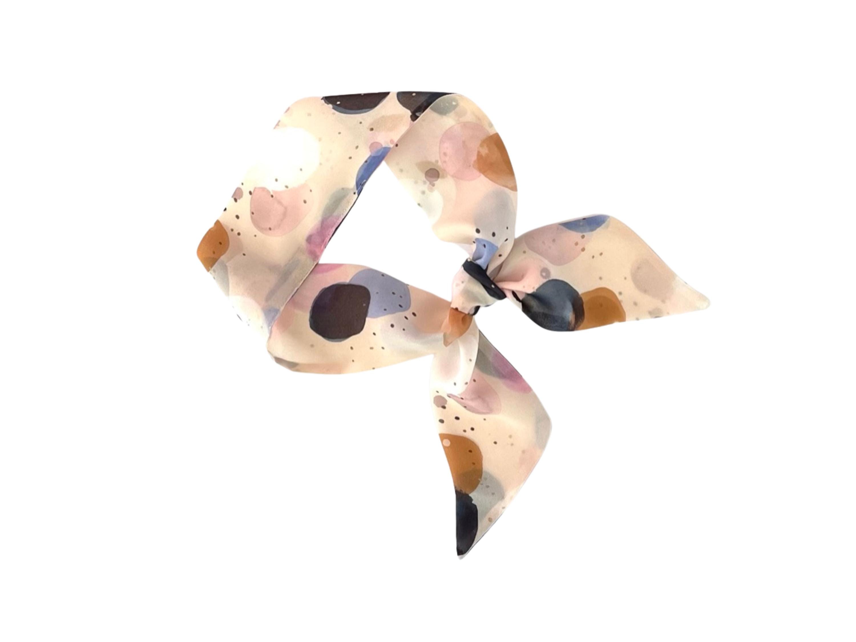 This hair scarf's print has various sizes of polka dots sprinkled with small speckles of dots.