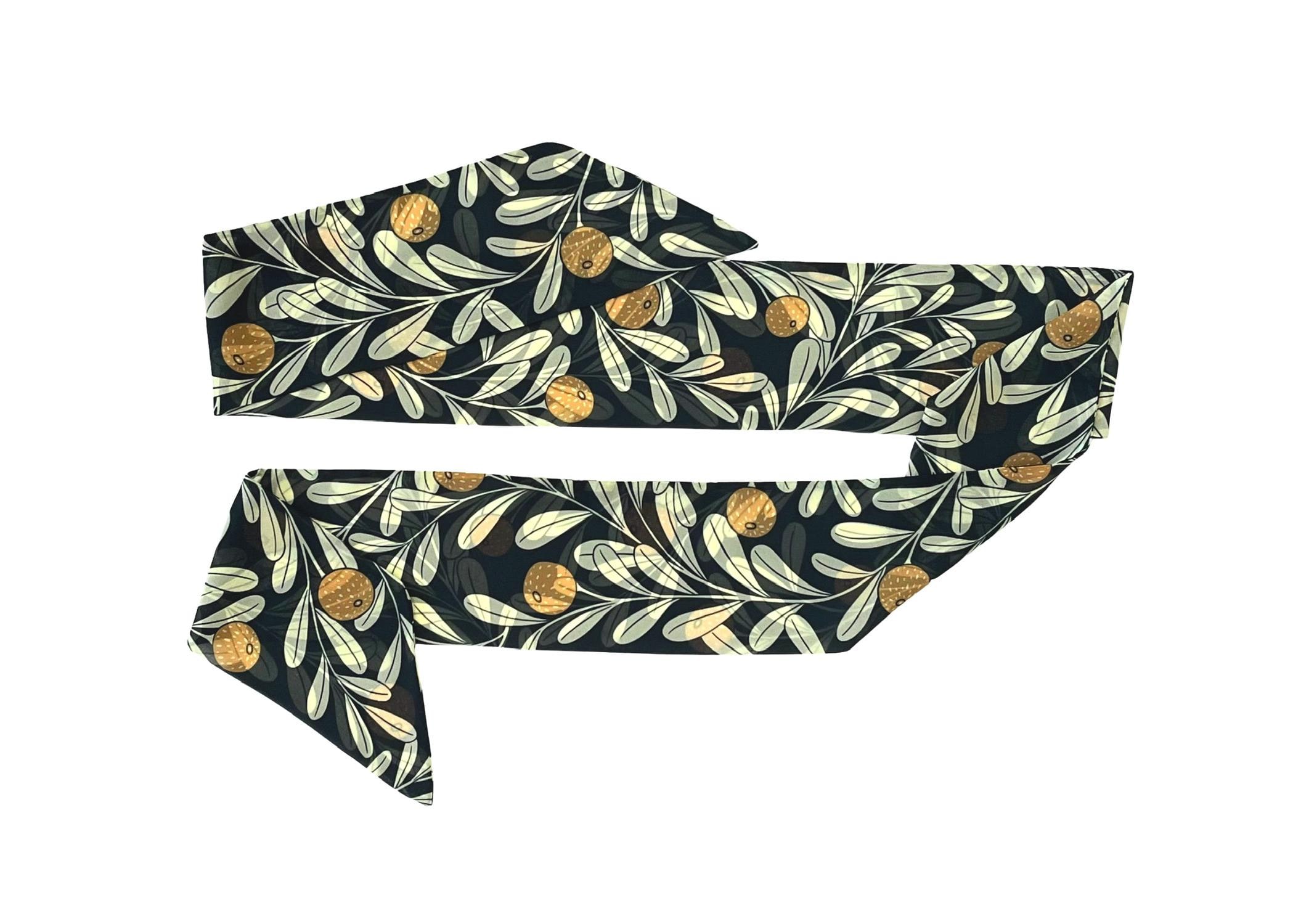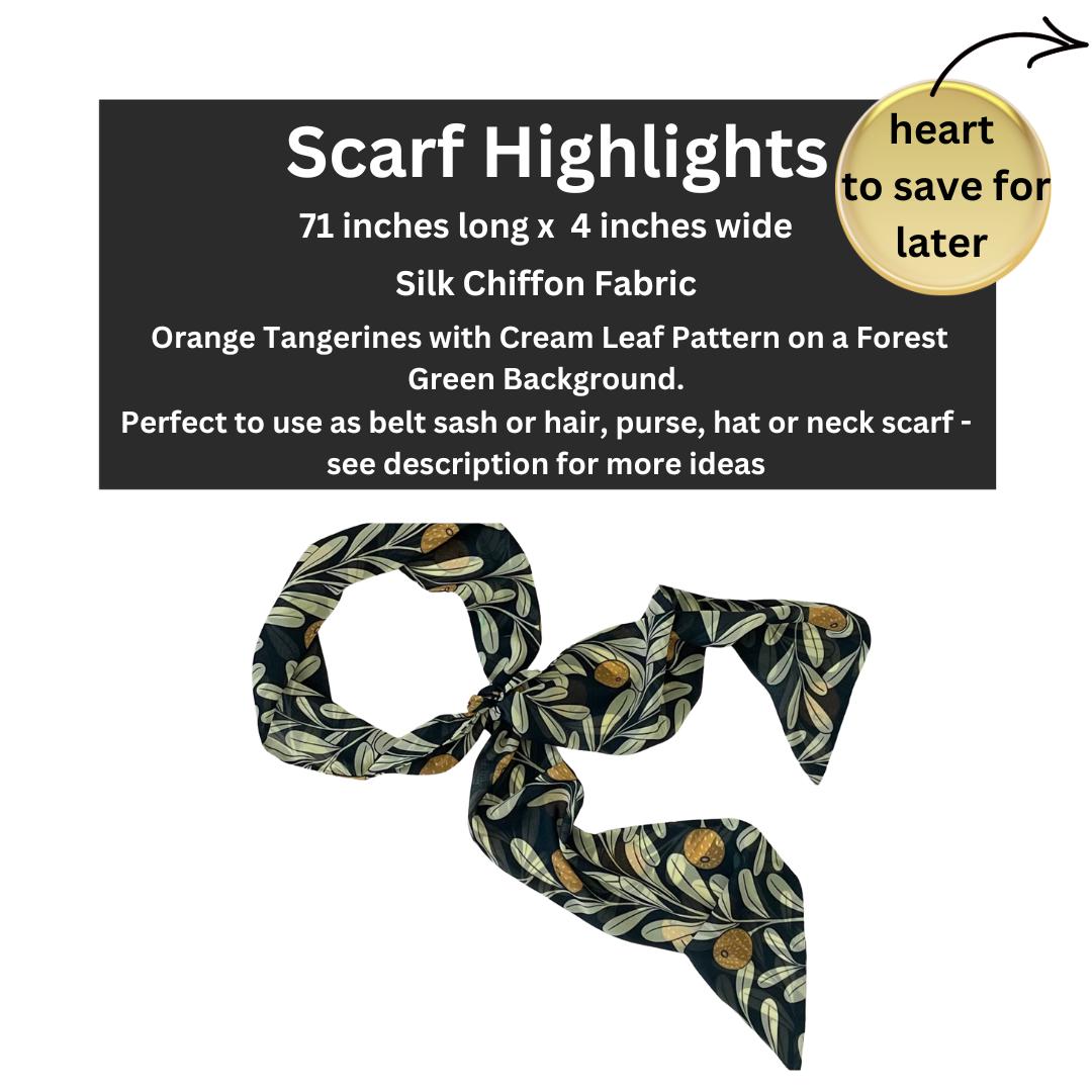 The scarf has orange tangerines and a cream leaf pattern set on a forest green background.