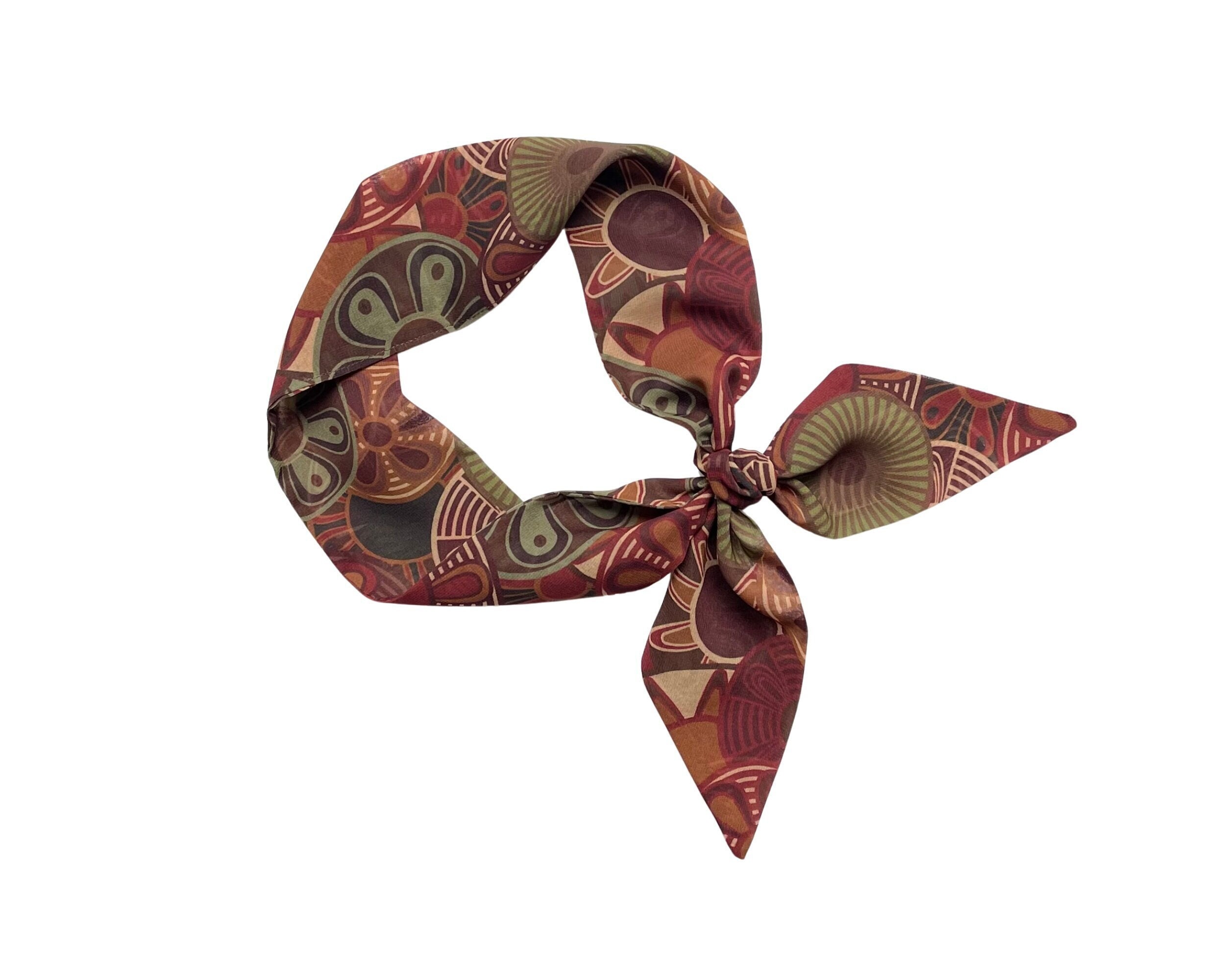 This hair scarf is a pattern of flowers in the colors of olive green, beige and burgundy set on a deep brown background.