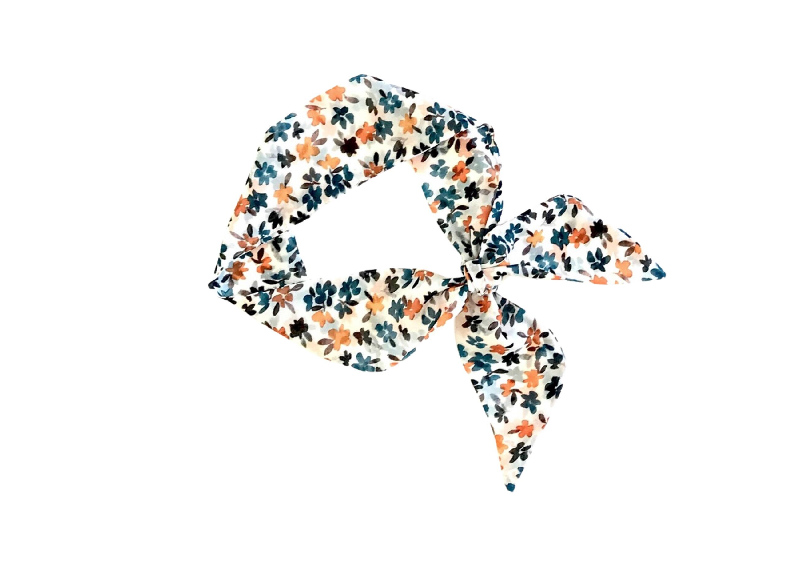 This short hair scarf is a cute floral print in the colors of teal blue, orange, brown and black set on a white background.