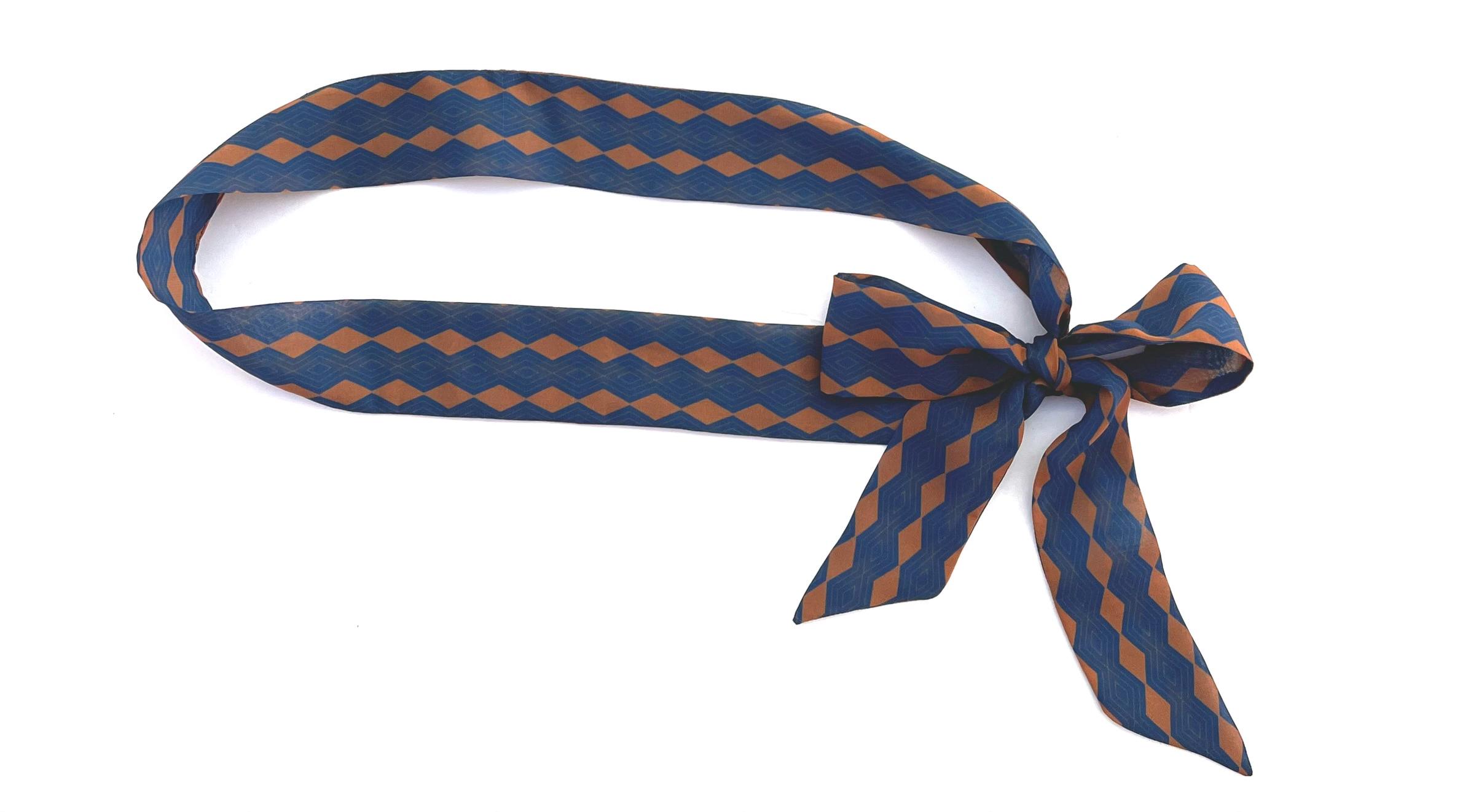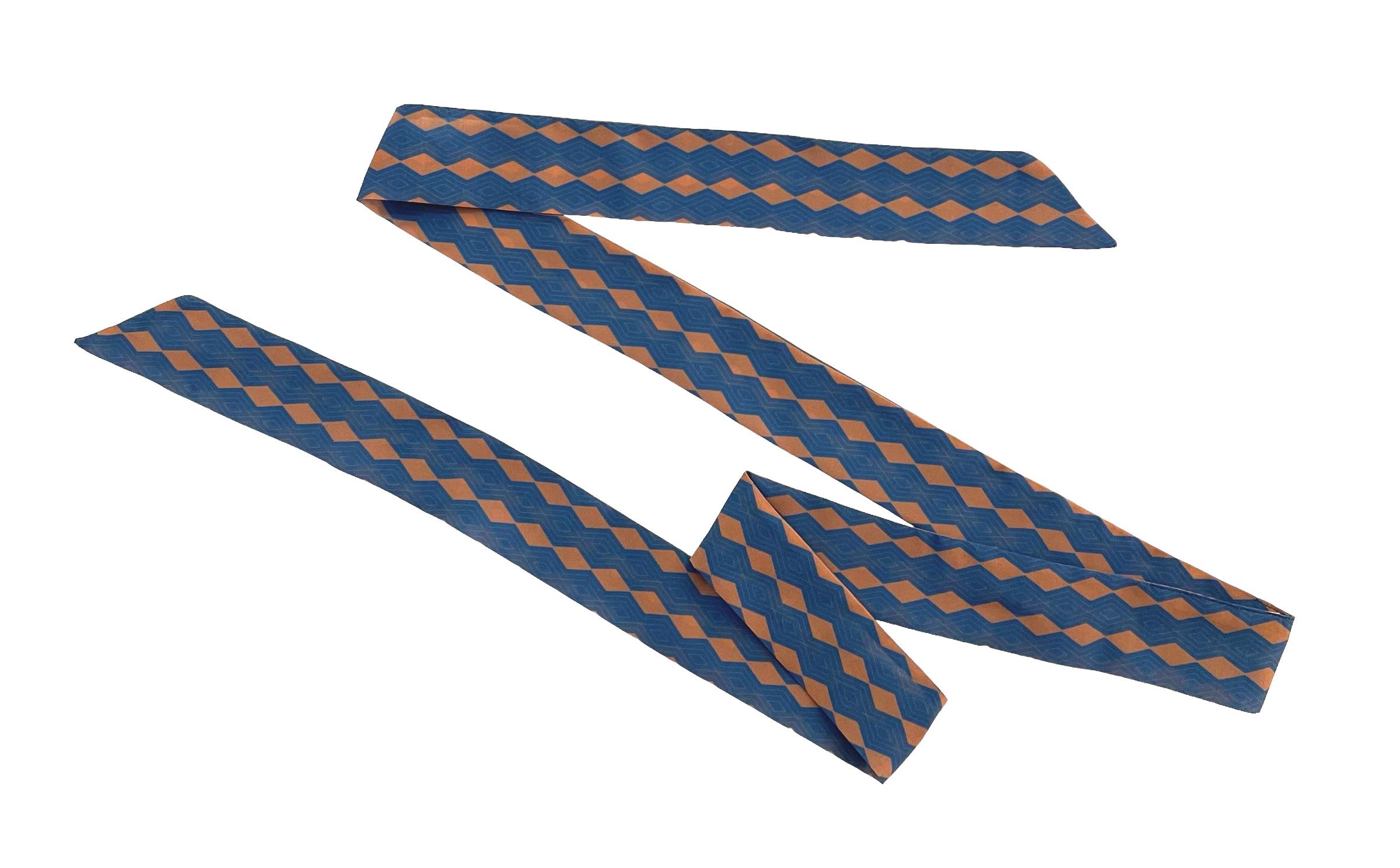 This scarf is a striped diamond pattern in the colors of navy blue and gold. A faint diamond pattern is replicated within the navy blue stripe. (Photo 7)