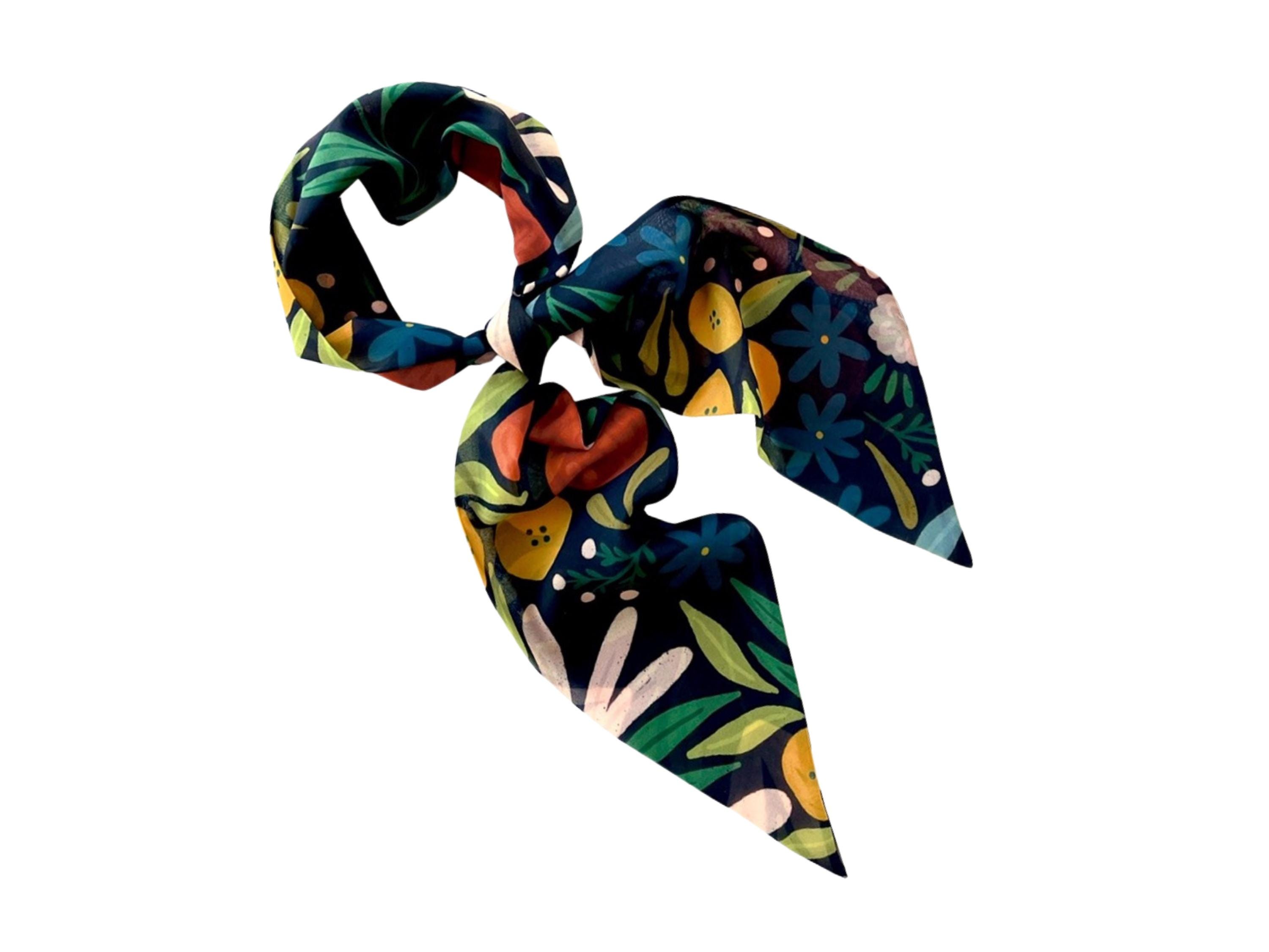 This long scarf is a print of flowers, leaves and stems in the colors of mustard yellow, orange, green, peach and midnight blue set on a black background.
