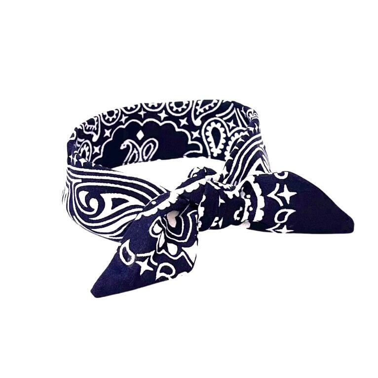 This hair wrap is a blue bandana print.