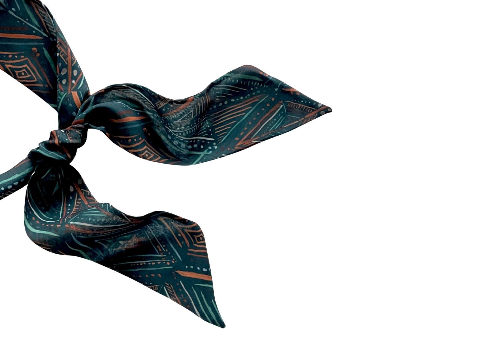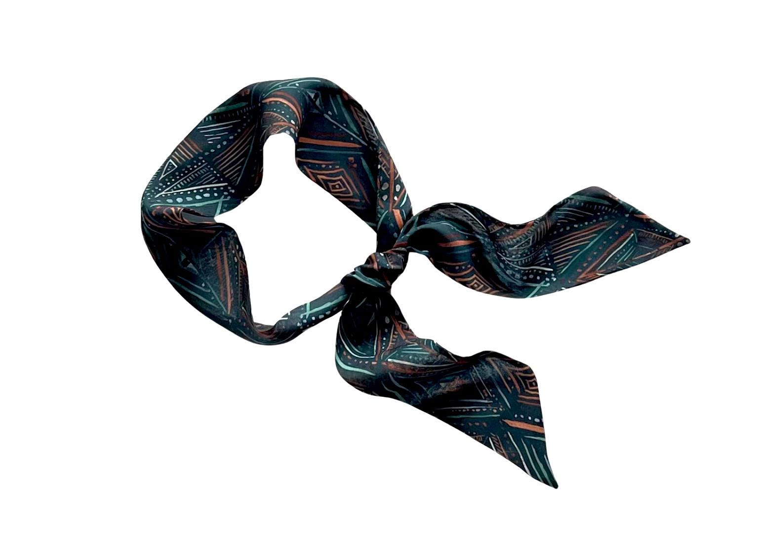 This long skinny scarf is a geometric print made in a chiffon fabric.