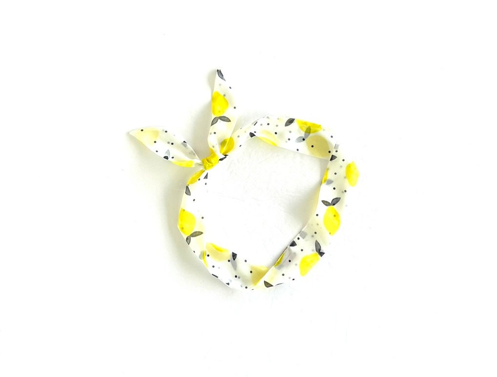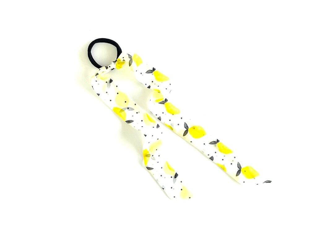 This ribbon hair tie has cute yellow lemons and black polka dots set on a white background