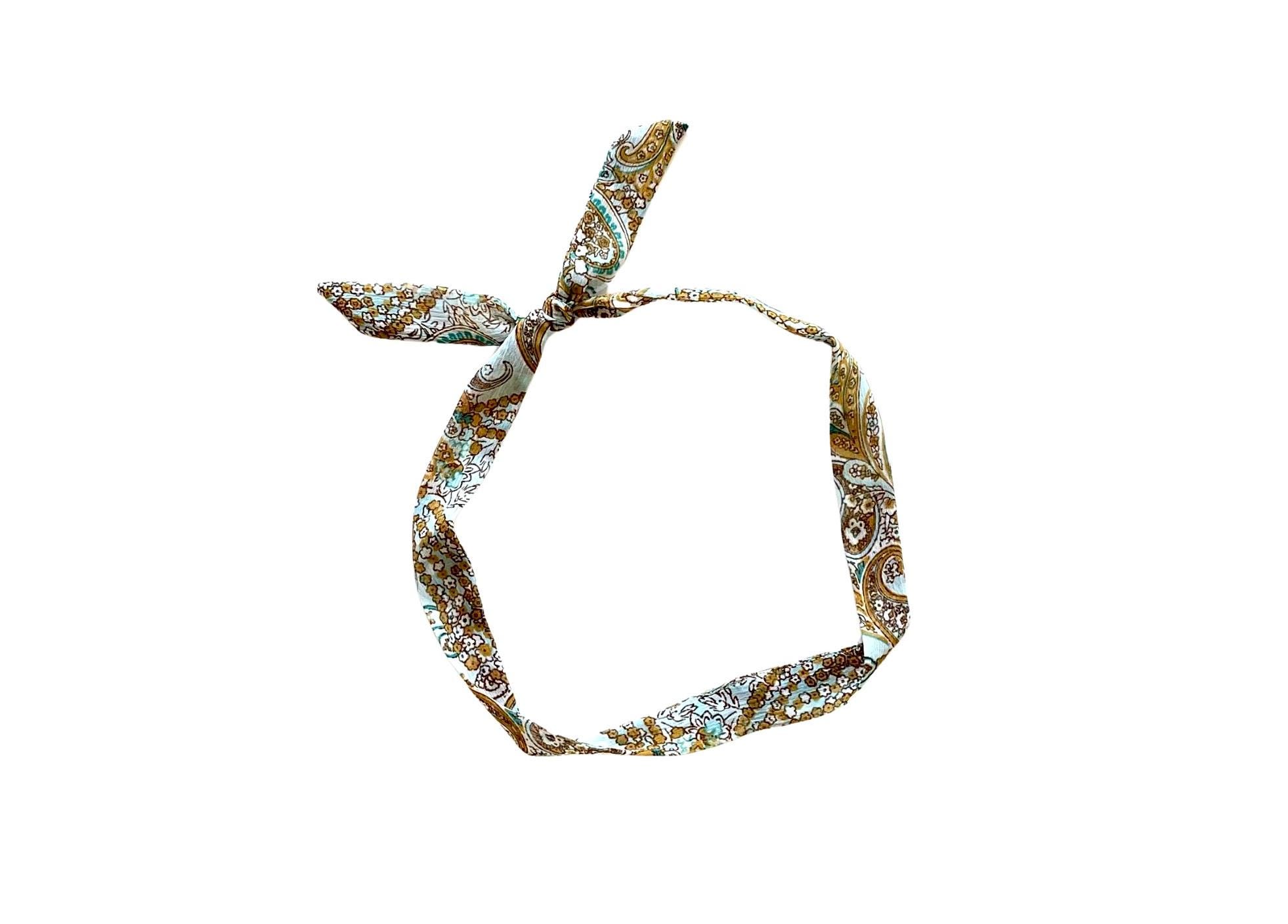 The print includes paisleys and petite flowers in the colors of light blue, mustard brown, turquoise and white.