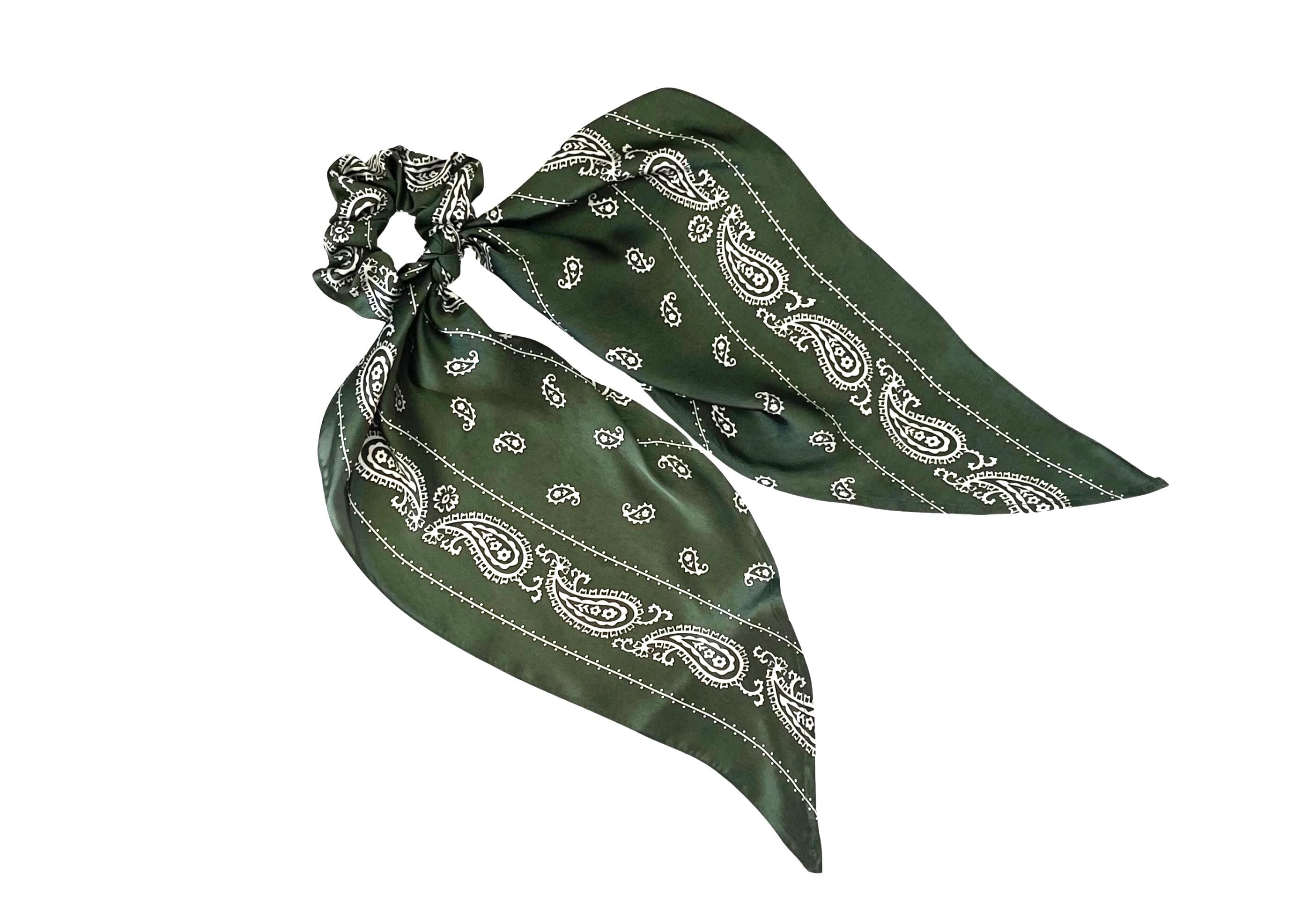 This scarf scrunchie features a classic white paisley print set against a rich green background for a timeless, eye-catching look.