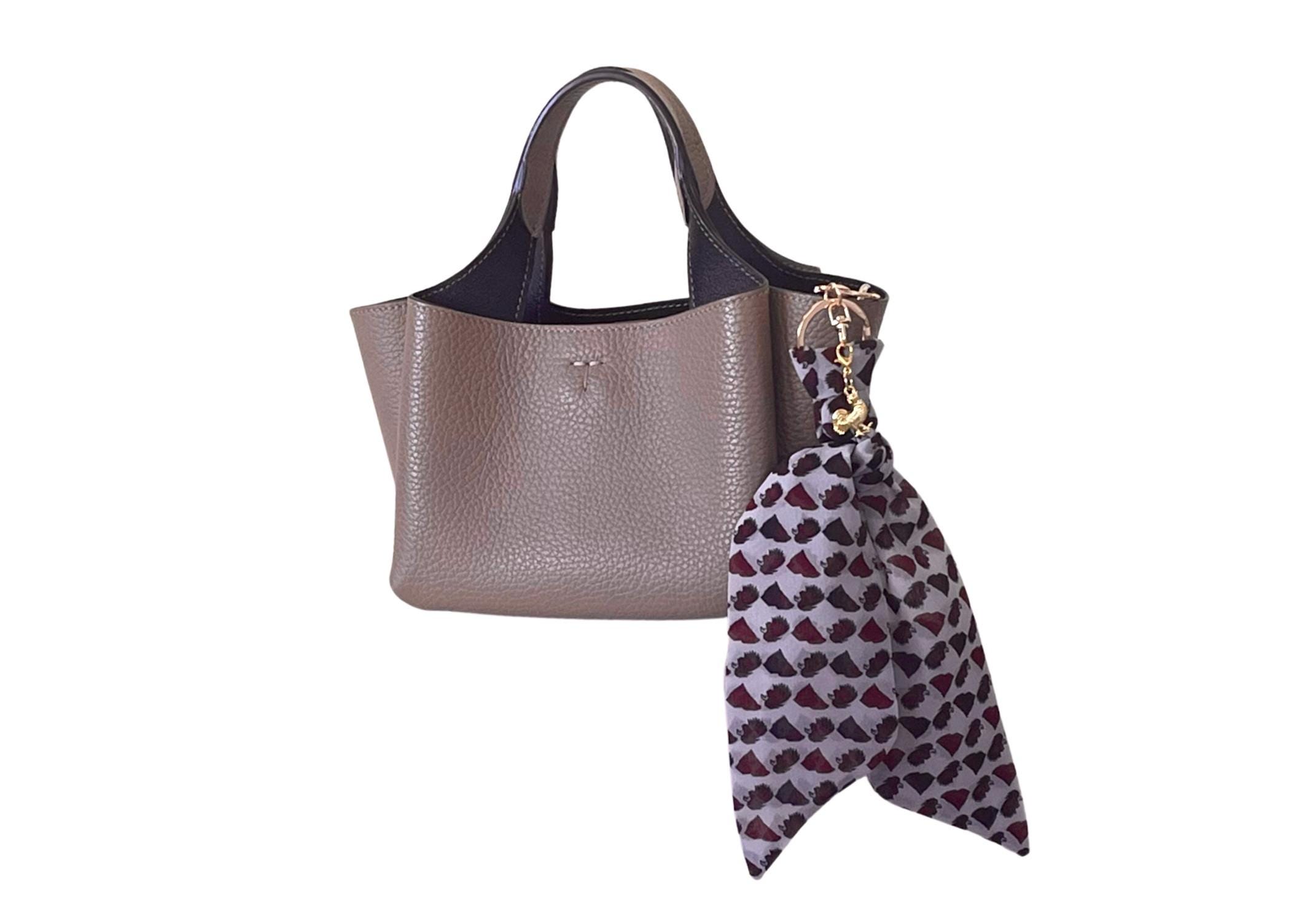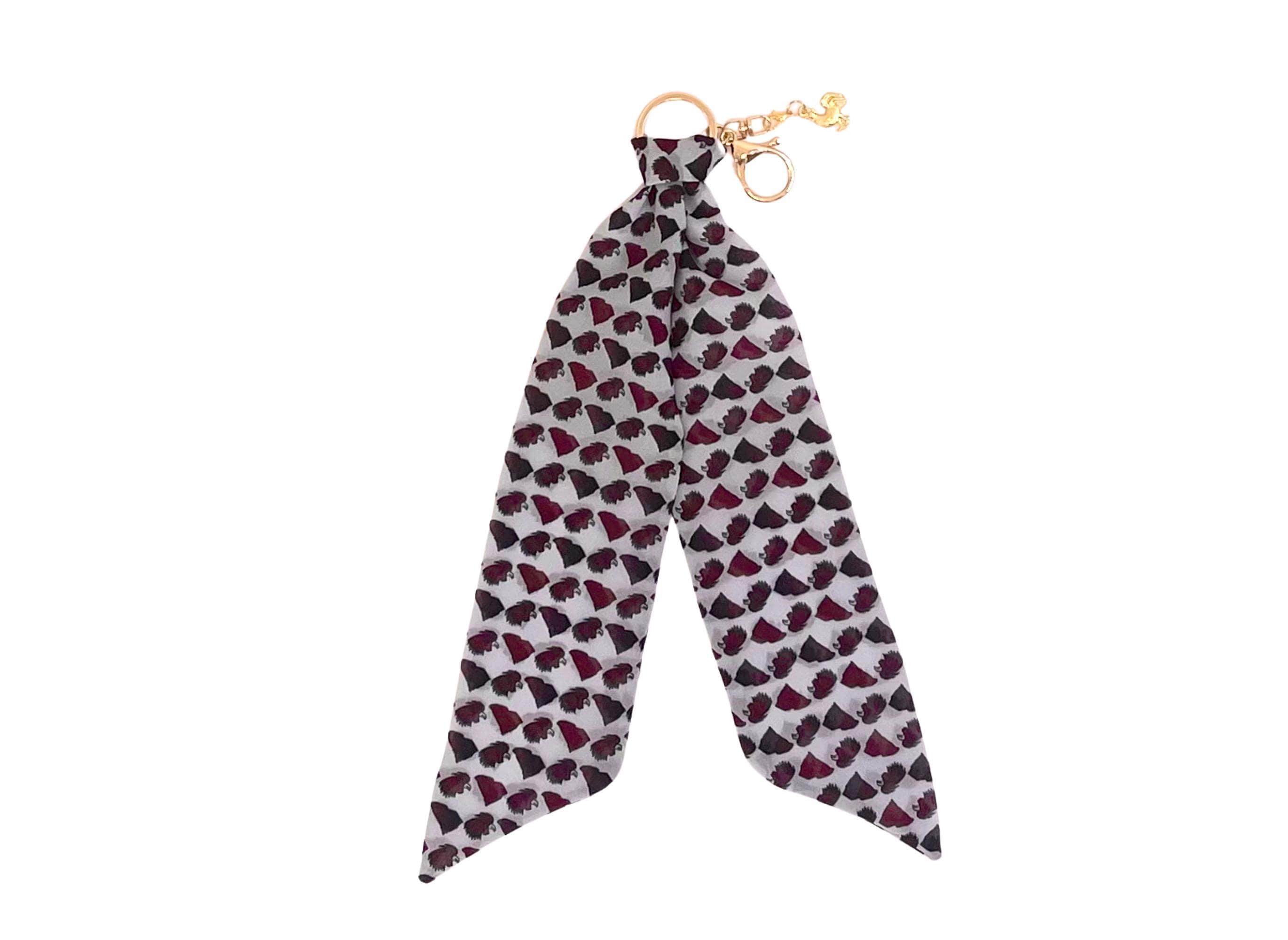 The scarf is attached to a swivel clip clasp. You will be able to remove this scarf keychain easily from your handbag by pressing on the small nub located on the clasp's side.
