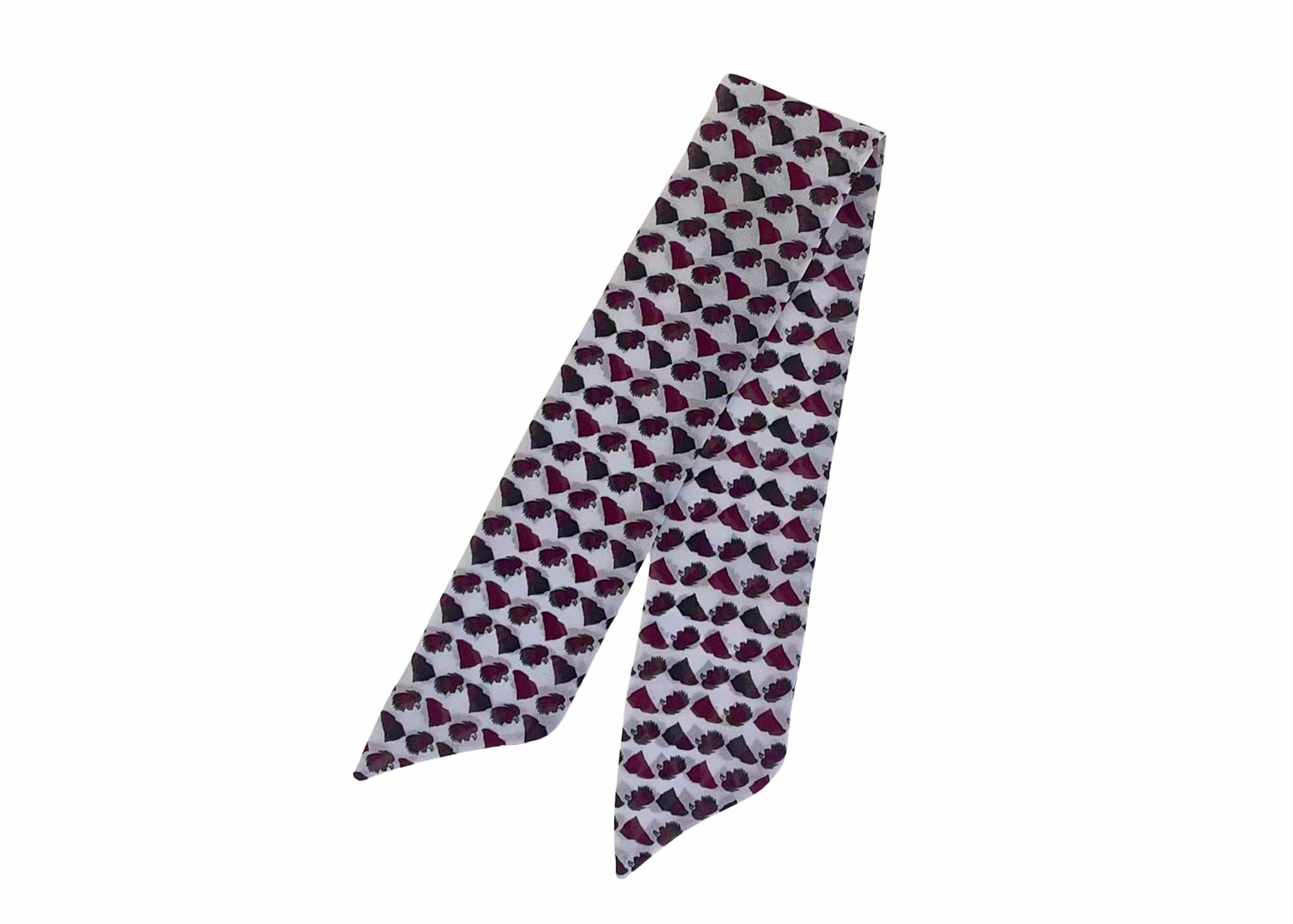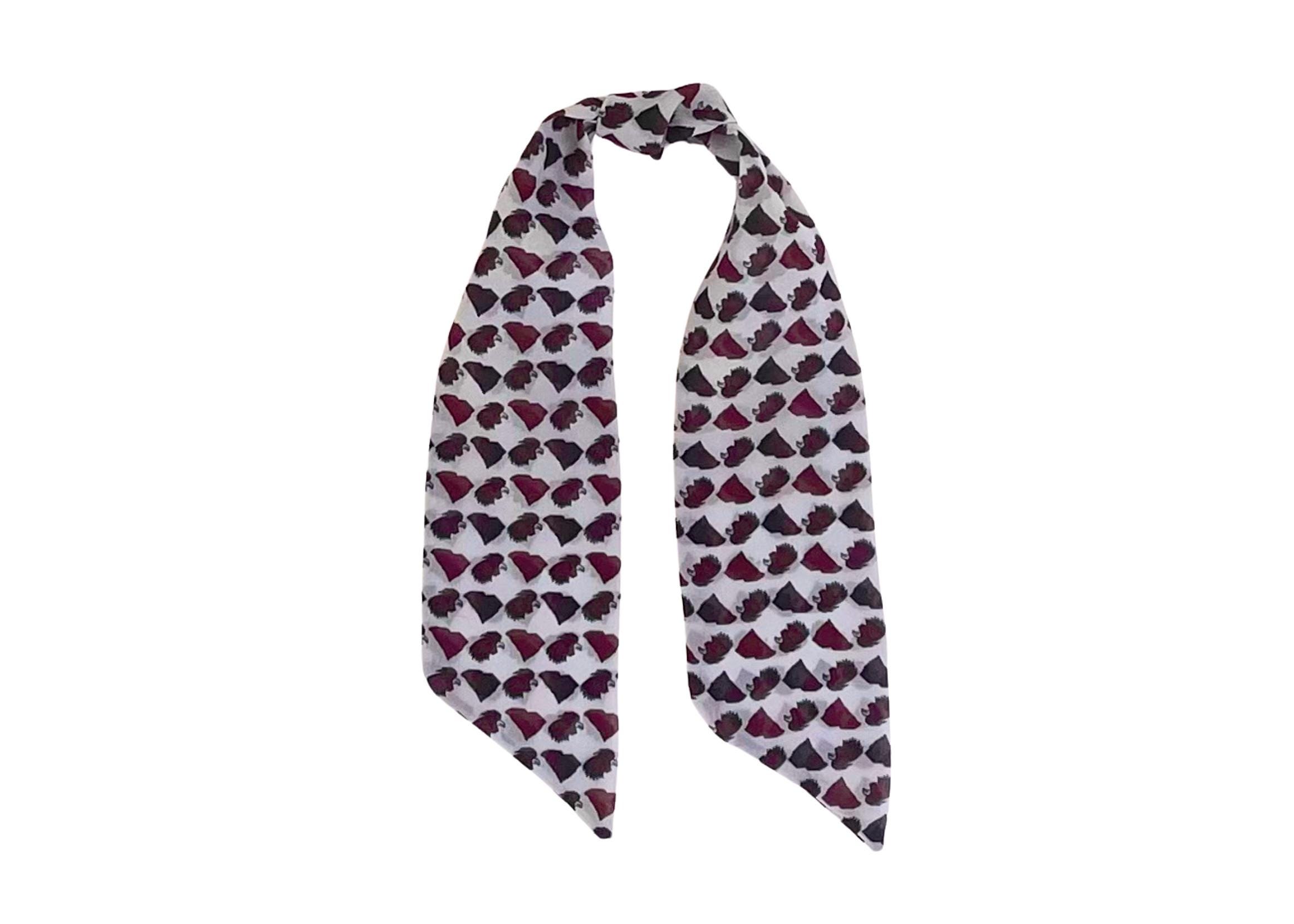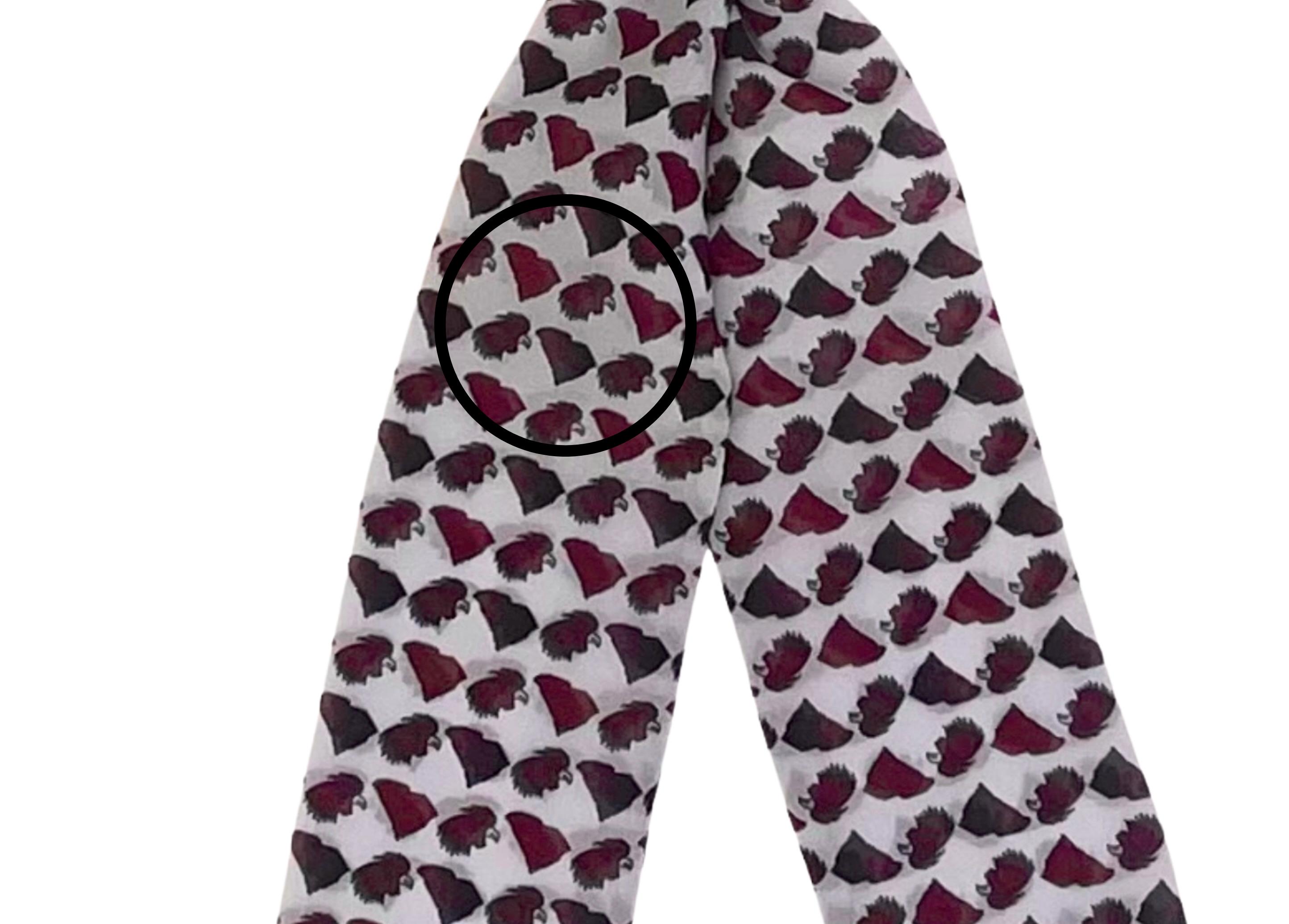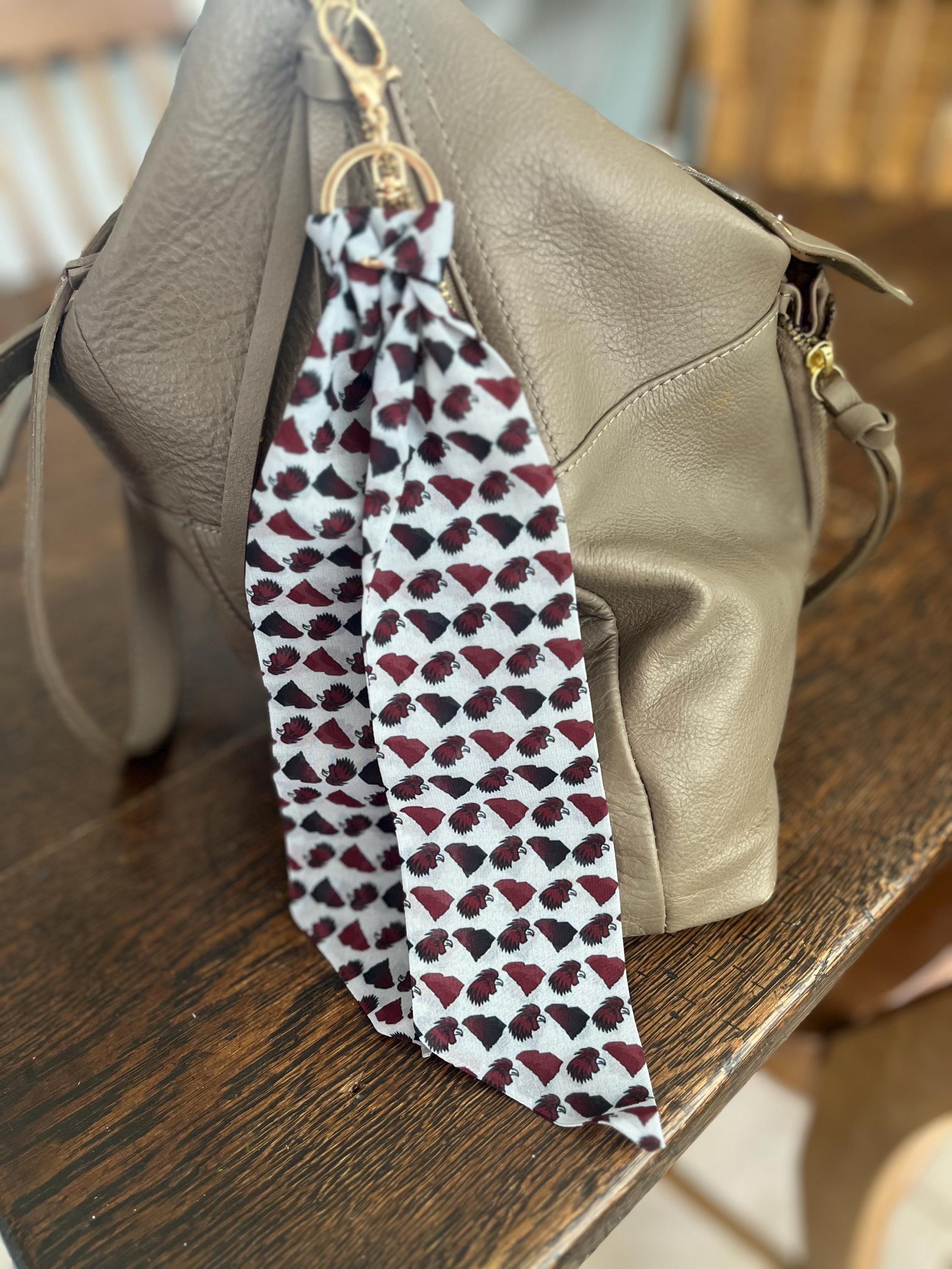 3) A subtle, standout touch! An adorable mini pattern of Gamecocks and the state of South Carolina is made out of a lightweight, easy to tie chiffon fabric. Colors in this scarf are garnet, black and white set on a gray background.