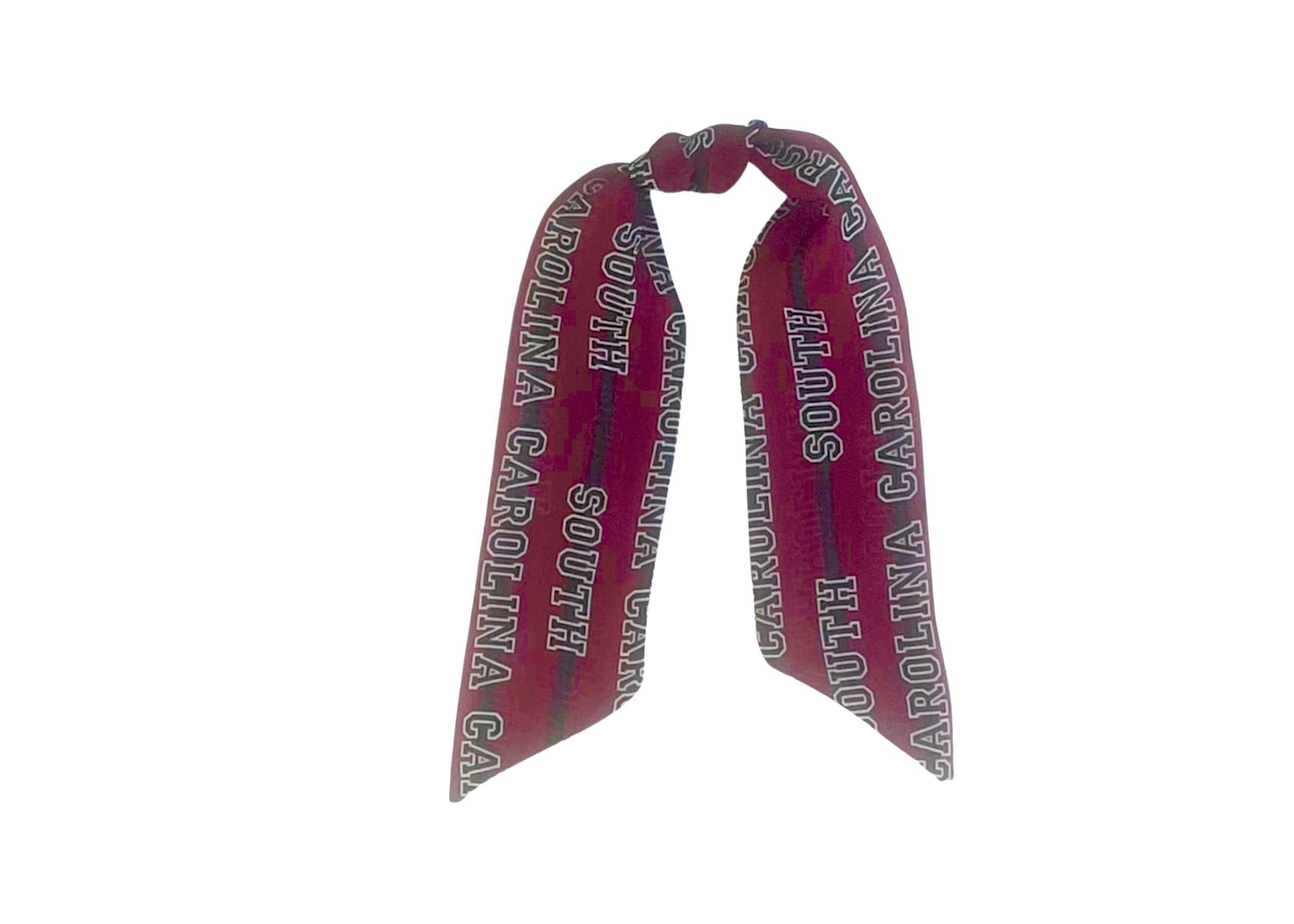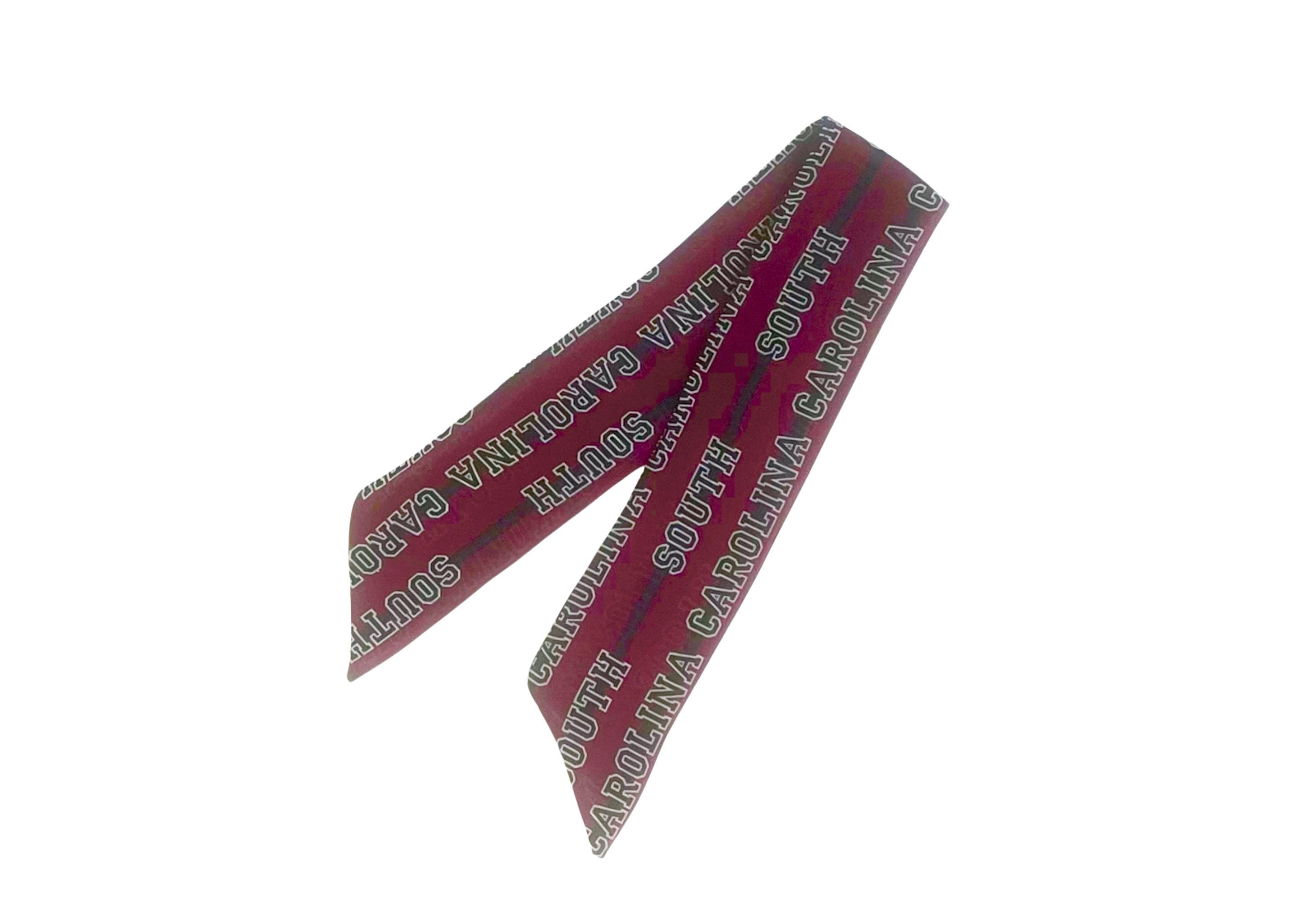 1) SOUTH CAROLINA print is made out of a lightweight, easy to tie chiffon fabric. The pattern has the words "SOUTH CAROLINA". Colors in the scarf are white and black set on a garnet background.