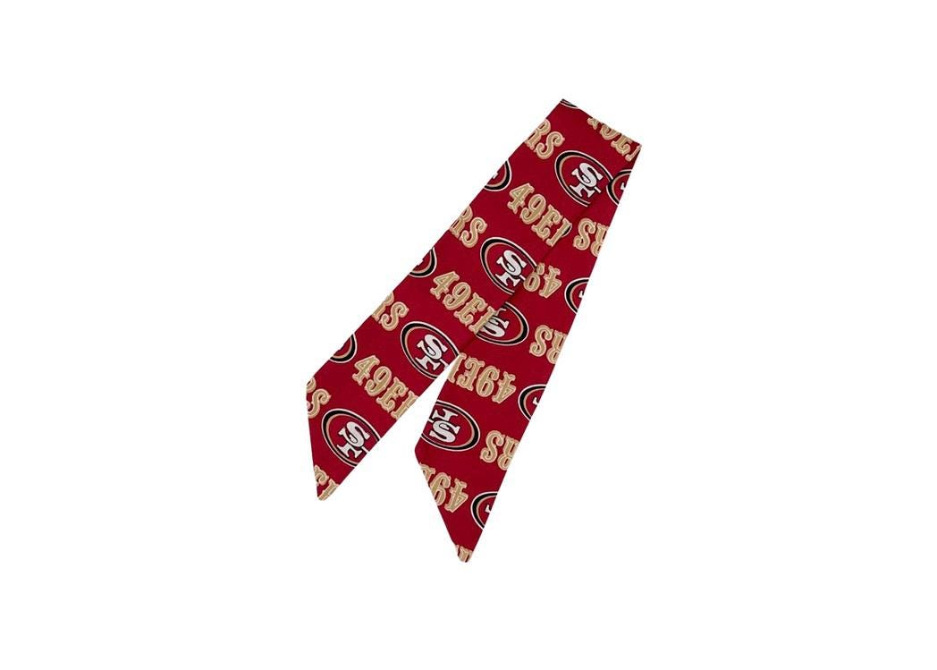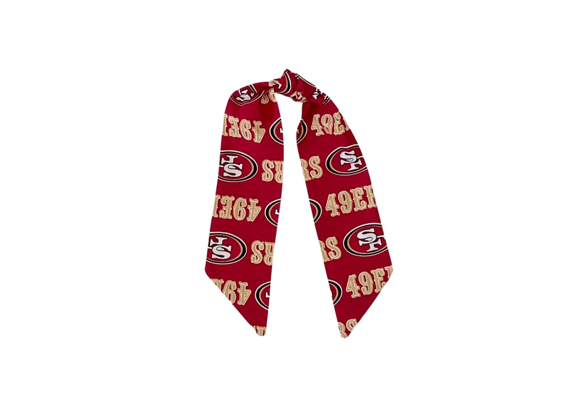 1) GO 49ERS print is made out of a lightweight, easy to tie chiffon fabric. Colors in the scarf are gold, white, brown and black set on a red background.
