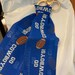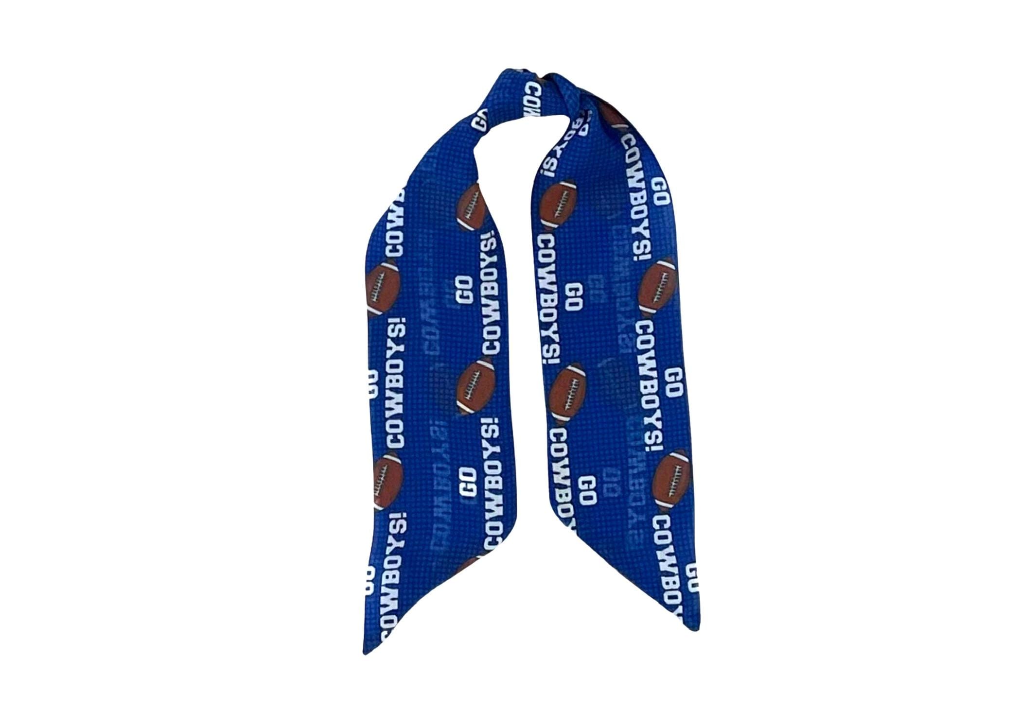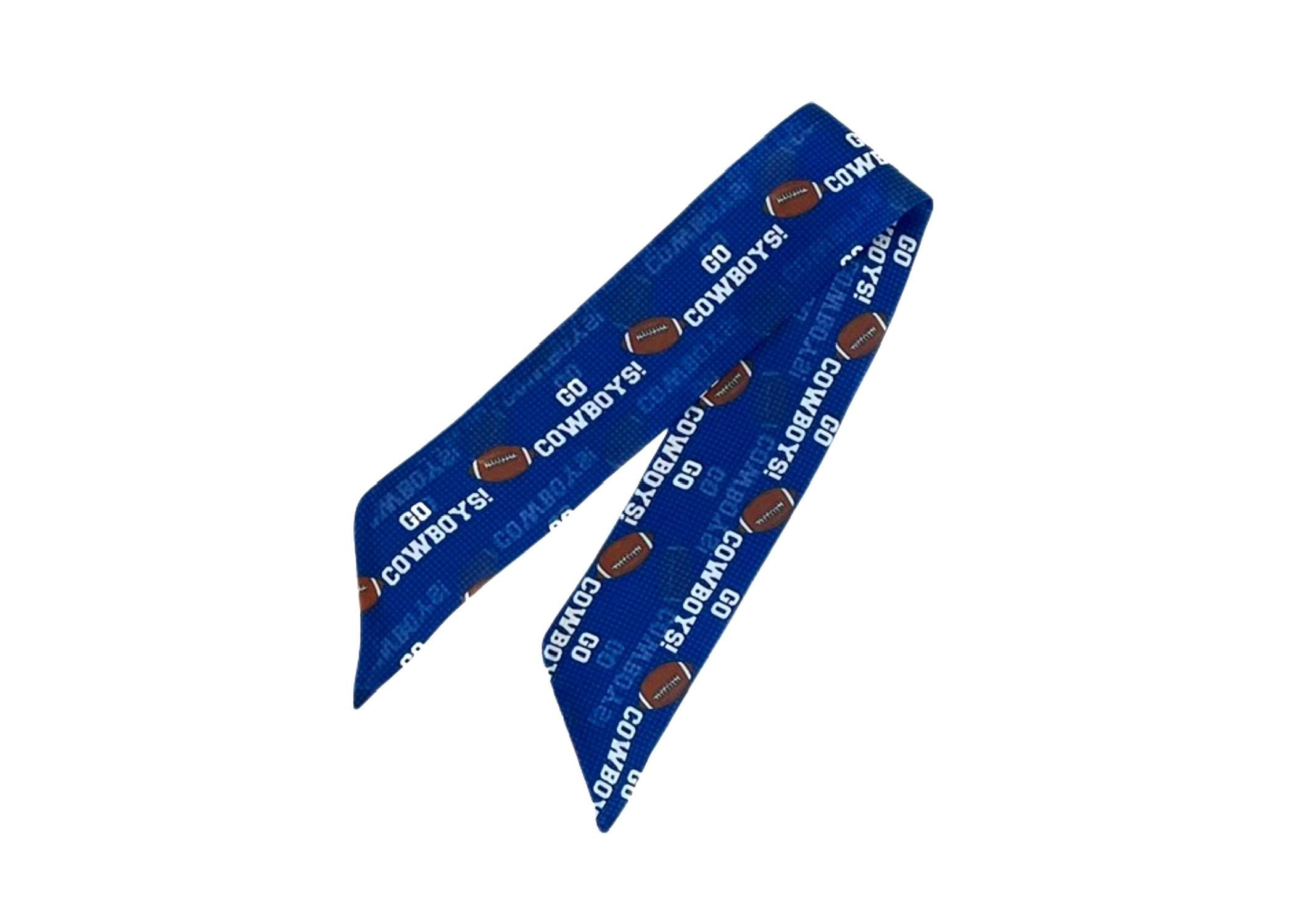 This scarf is made in a lightweight chiffon fabric. The scarf's pattern has the words "Go Cowboys" and a football. Colors in the scarf are white, brown and black set on a blue background.