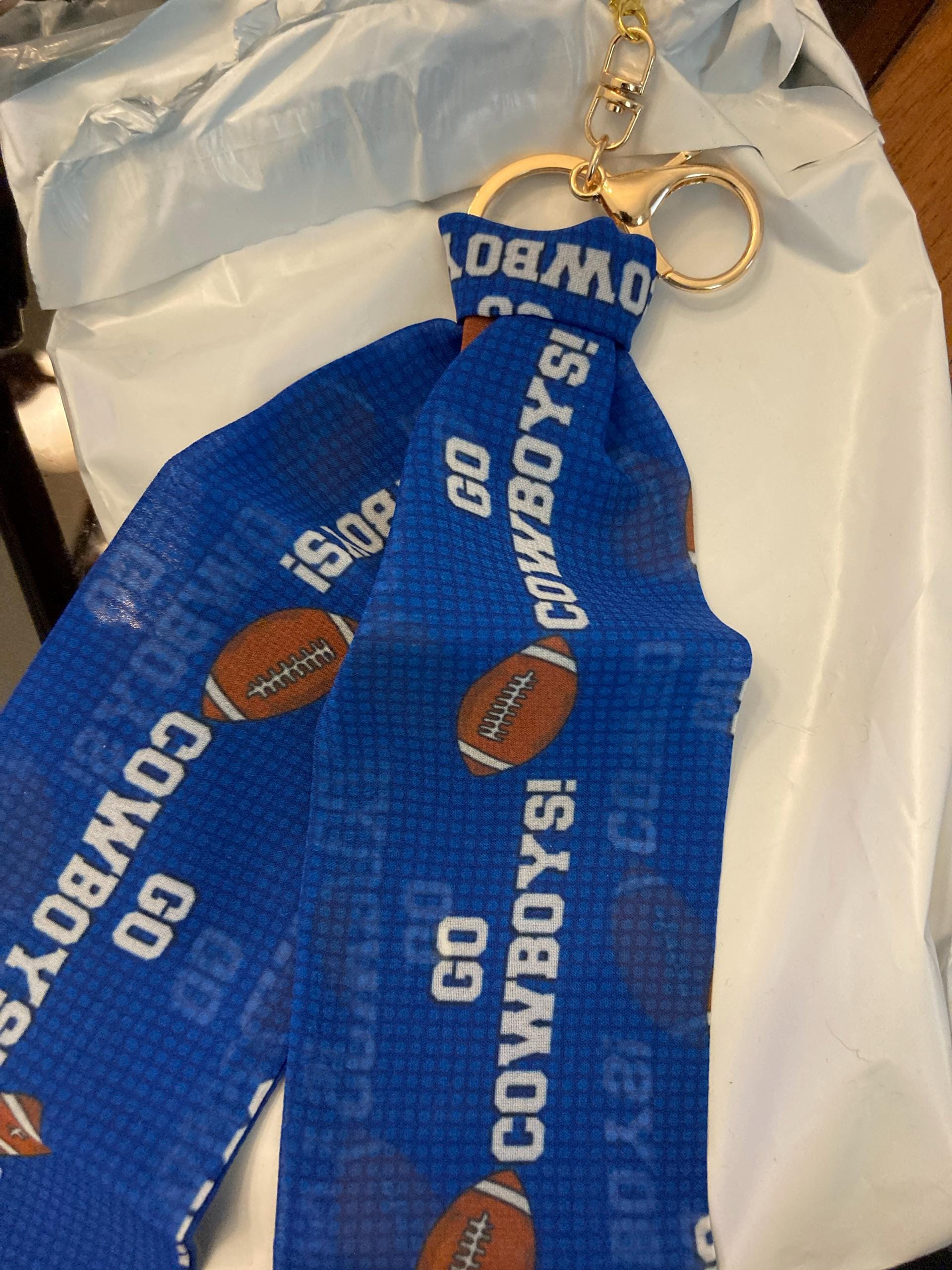 Add this cute Dallas Cowboys' scarf keychain with football charm to your purse.
