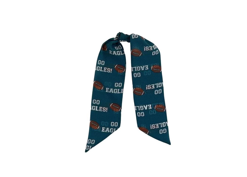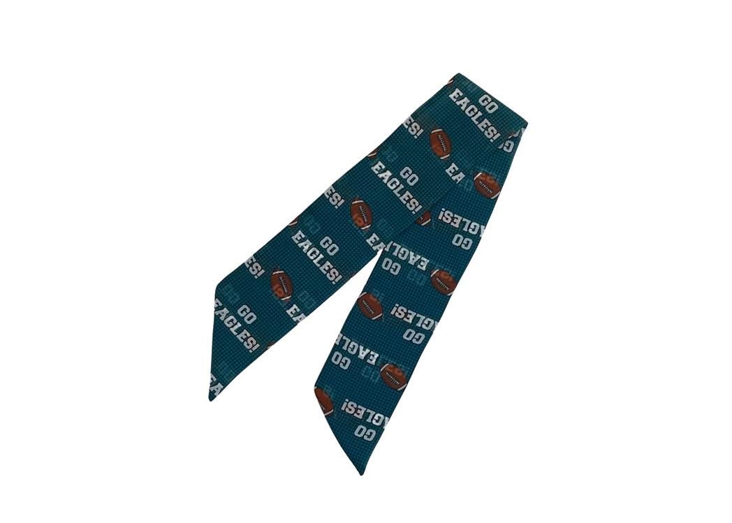 1) "Go Eagles" with football made out of a lightweight chiffon fabric. Colors in the scarf are white, brown and black set on a green background.