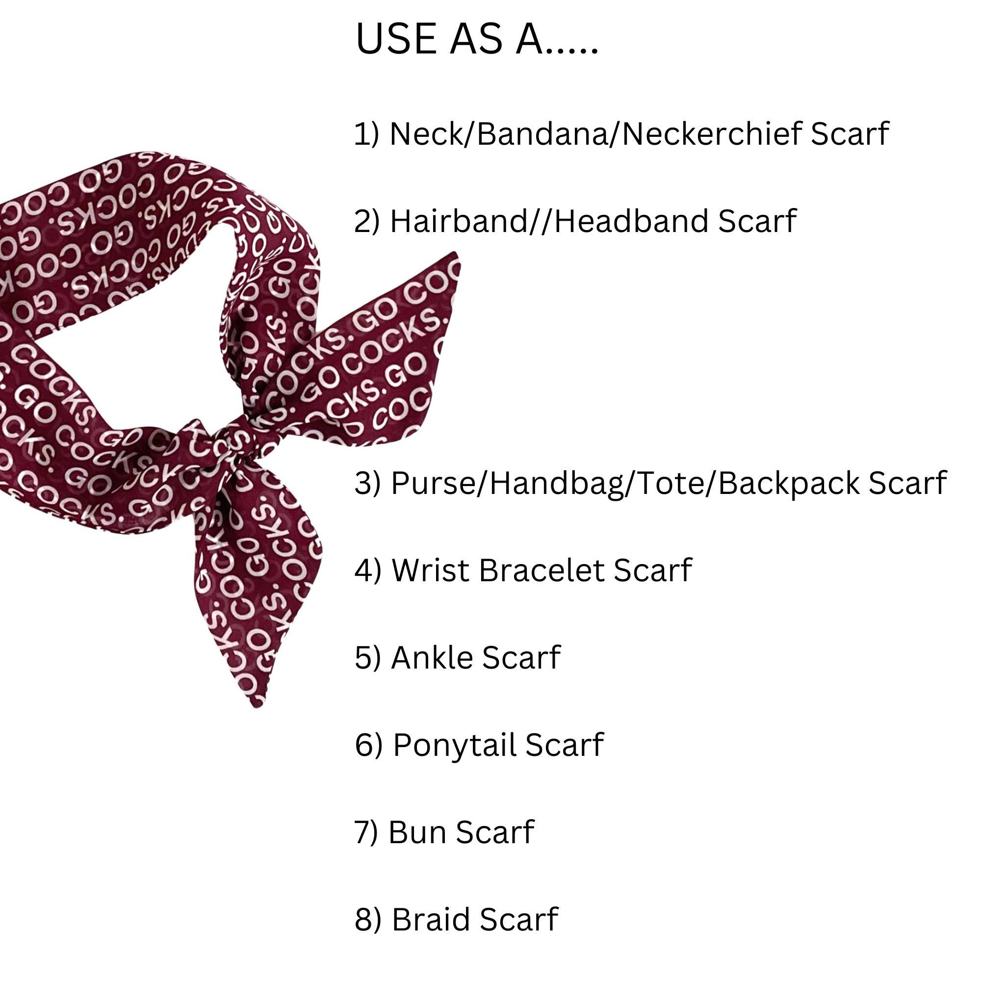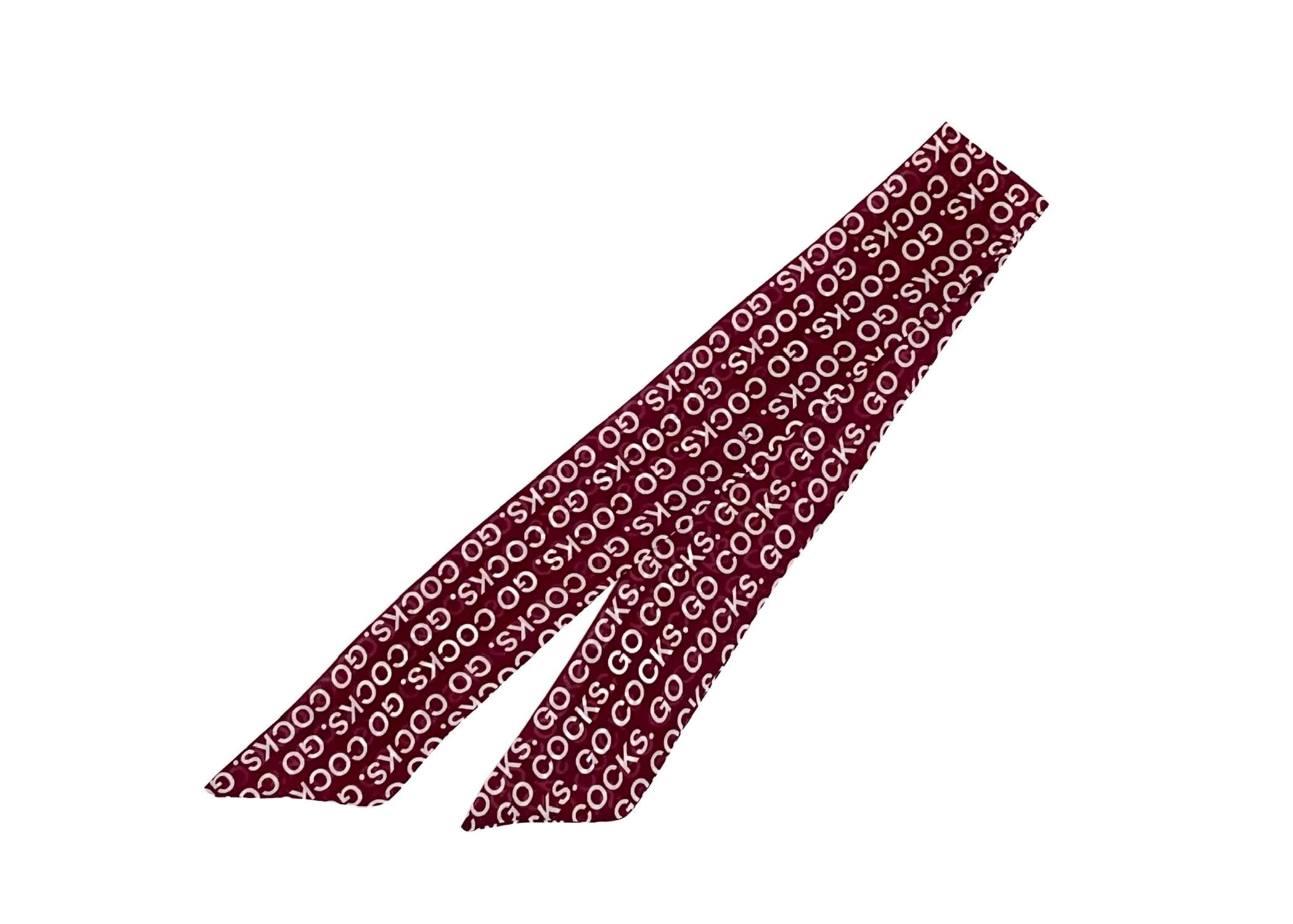 This scarf's print is "Go Cocks" and is made out of a lightweight, easy to tie chiffon fabric.