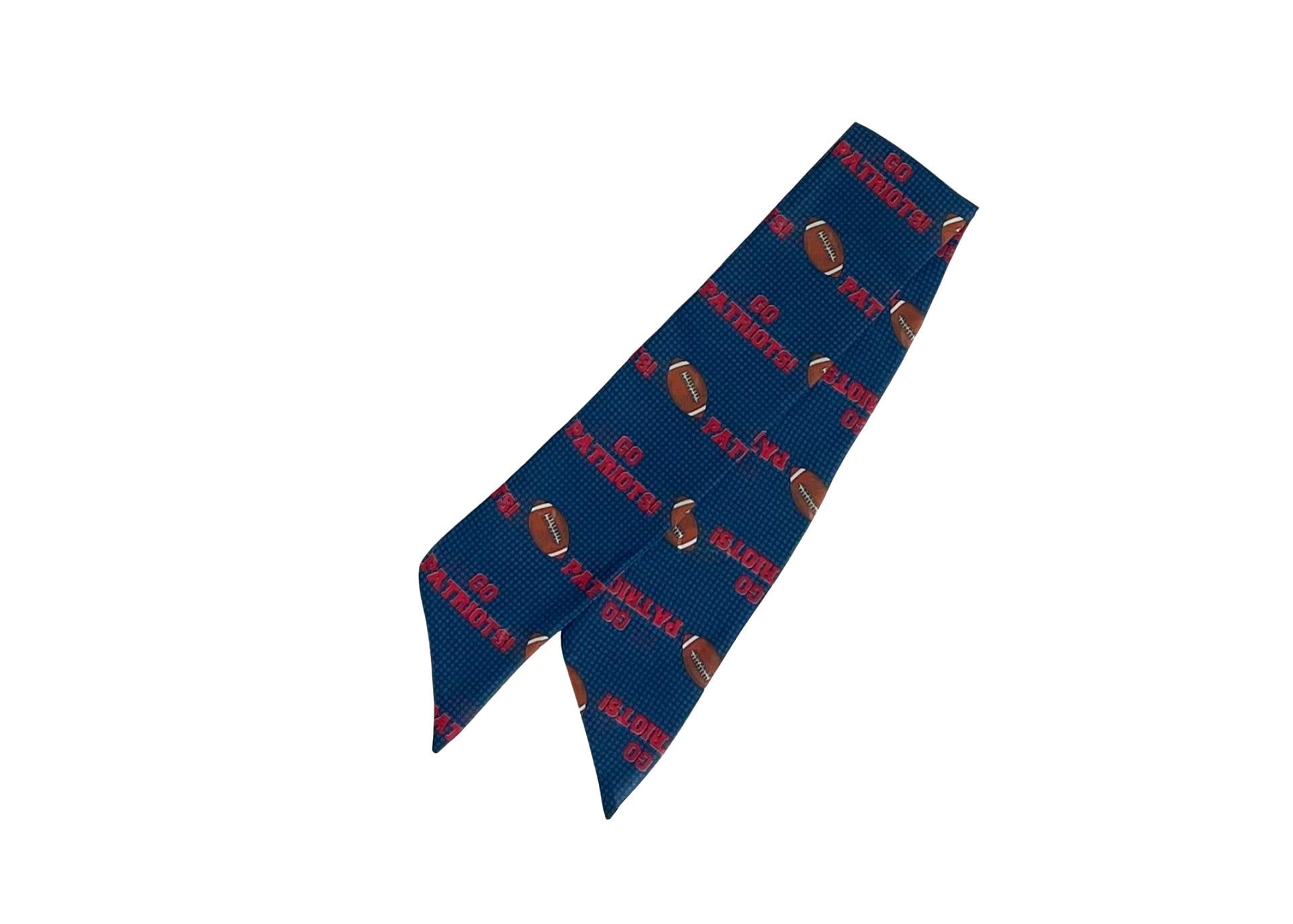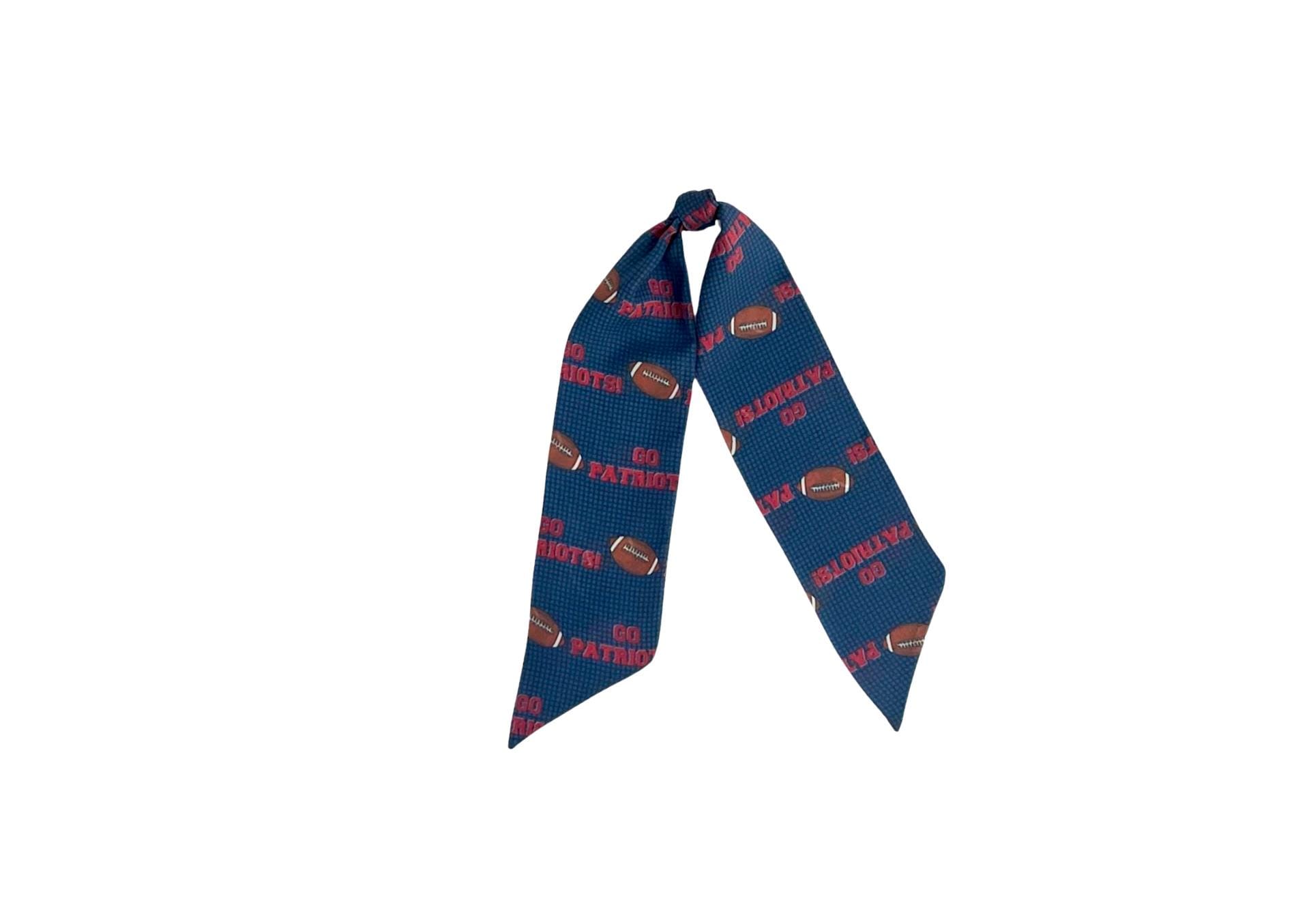 This scarf is made in a lightweight chiffon fabric. The scarf's pattern has the words "Go Patriots" and a football. Colors in the scarf are red, brown, white and black set on a blue background.