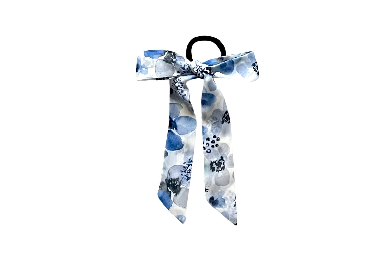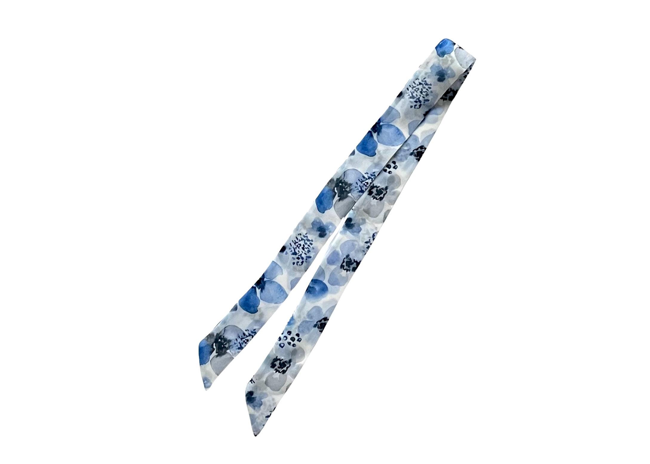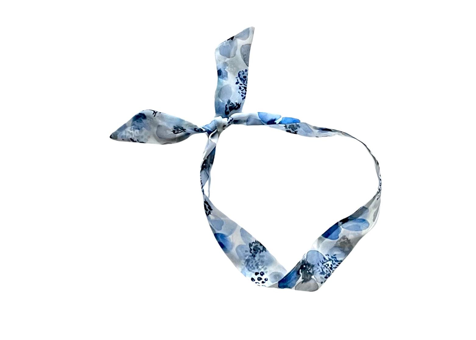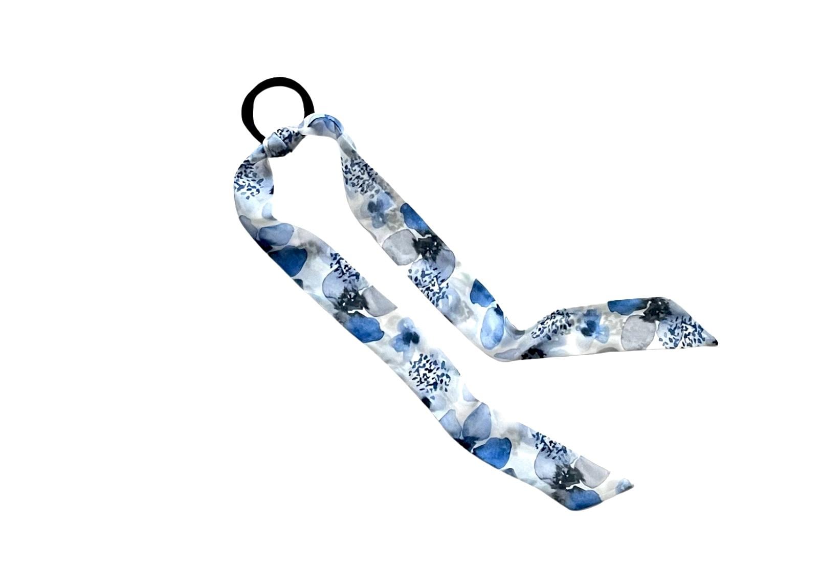 This hair tie scarf is a floral patternin the colors of blue, black and gray set on a white background.