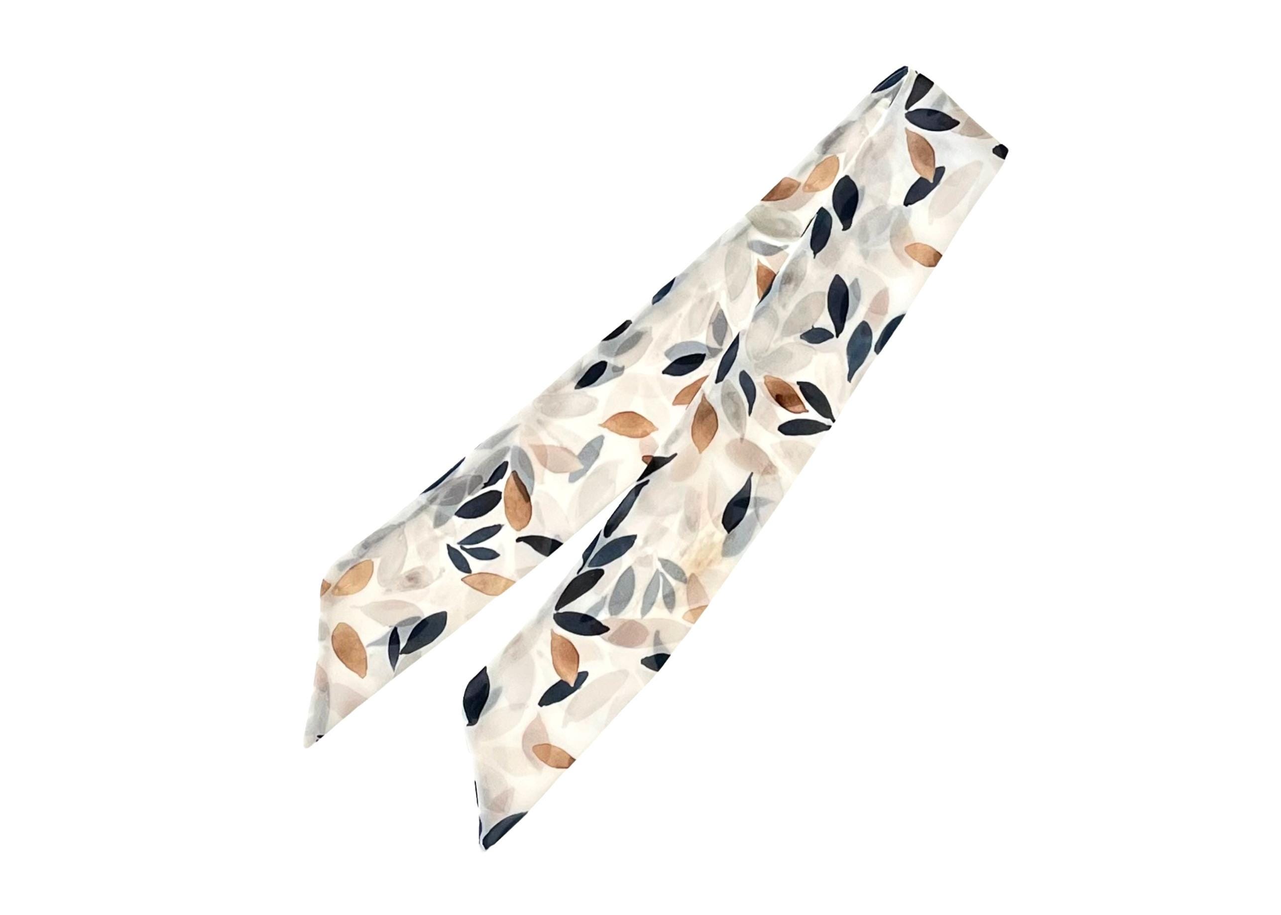 This short skinny scarf features a leaf print in navy blue, gold, and beige set against a white background. The rich color combination gives it a timeless yet modern look that easily complements both casual and dressy outfits.