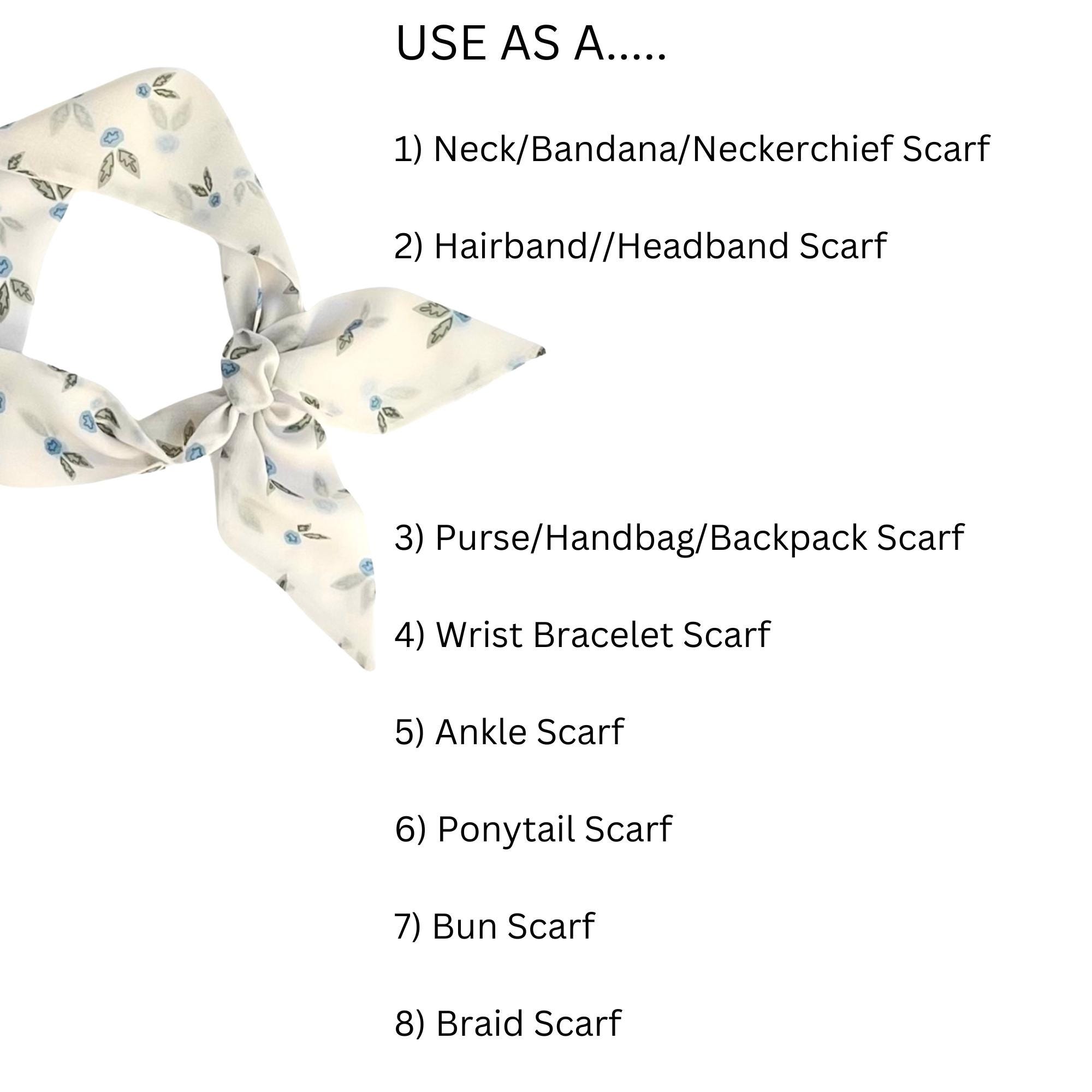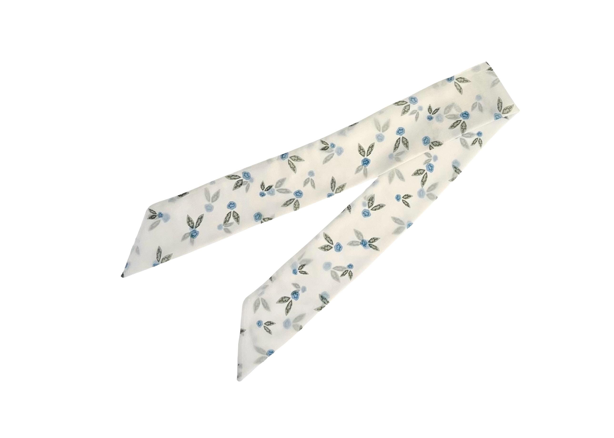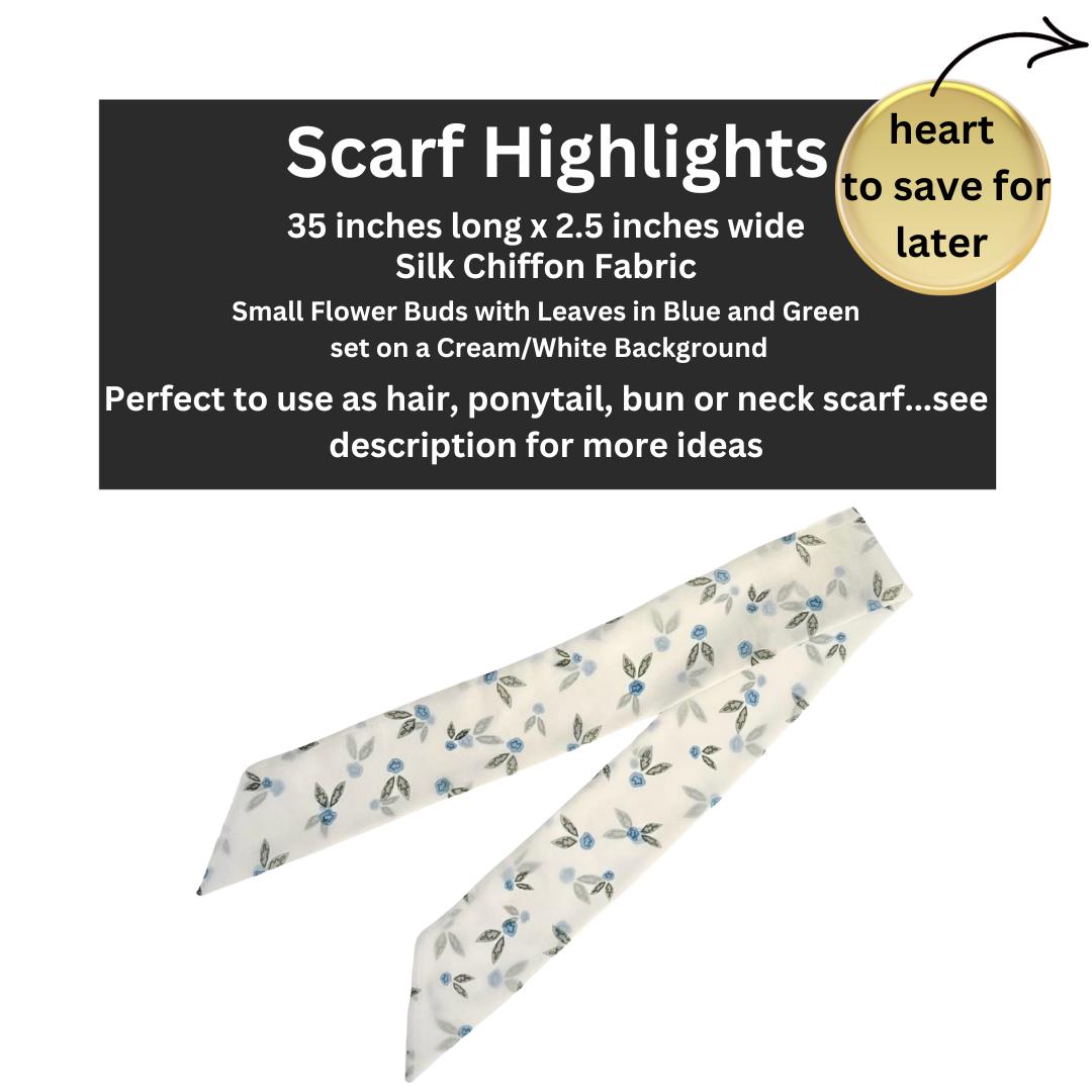 Add a soft, feminine touch to your everyday style with this charming skinny scarf. Delicate blue flower buds with fresh green stems are scattered across a creamy white background, creating a light and graceful look that pairs effortlessly with any outfit.