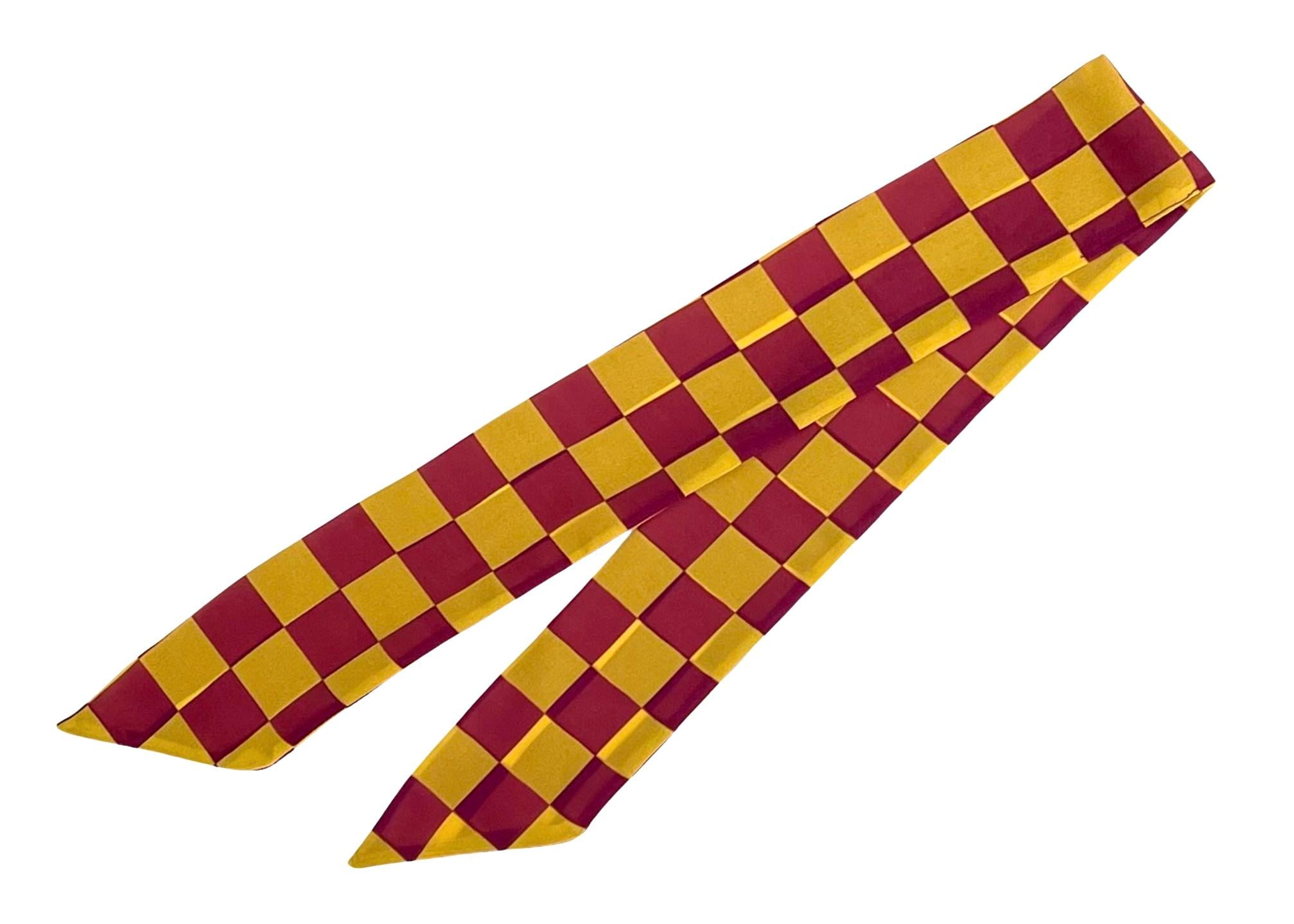 1) CHECKERED PATTERN is made out of a lightweight polyester chiffon fabric. Colors are crimson red and gold.