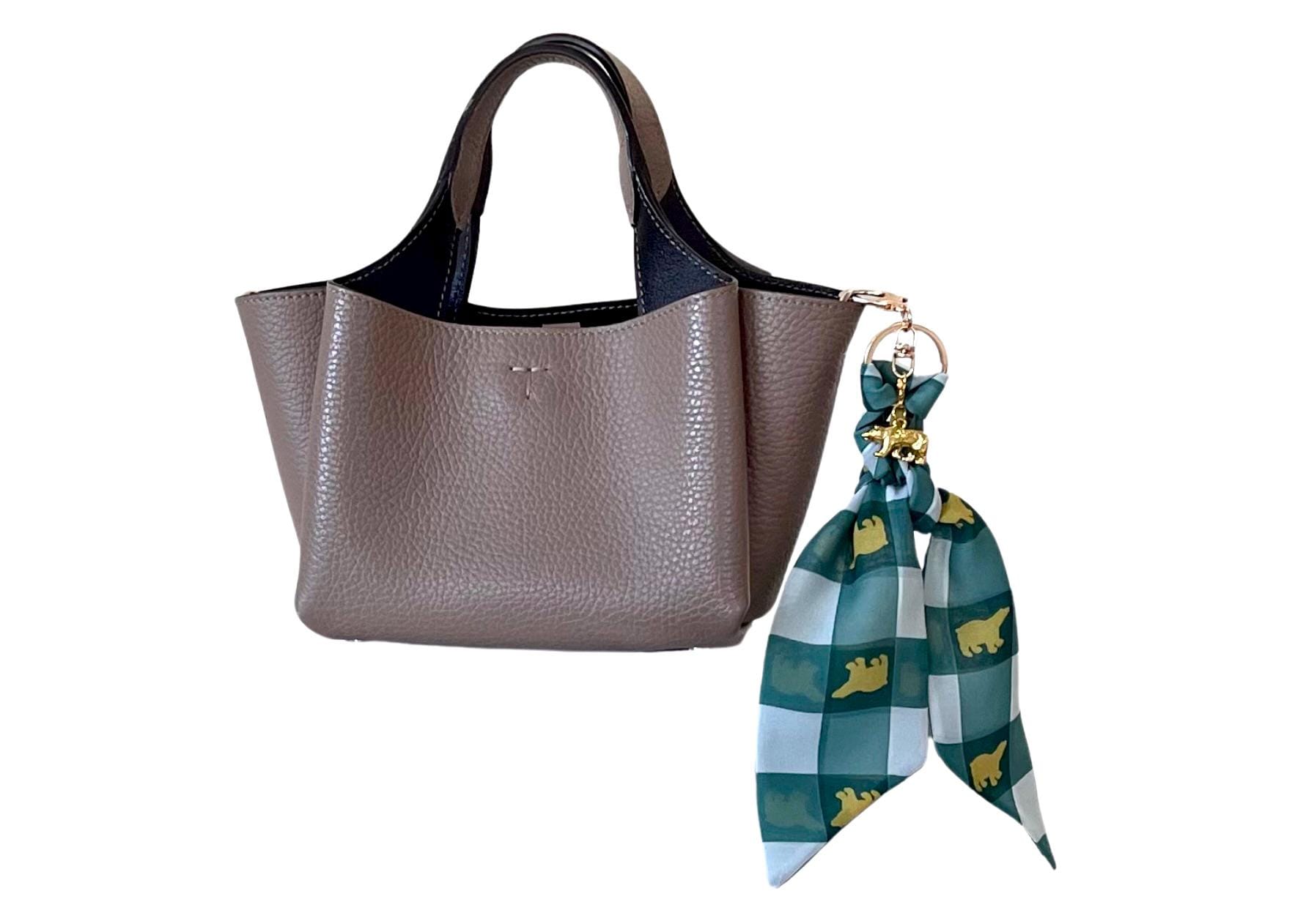 The scarf is attached to a swivel clip clasp. You will be able to easily remove this scarf keychain from your handbag by pressing on the small nub located on the clasp's side.