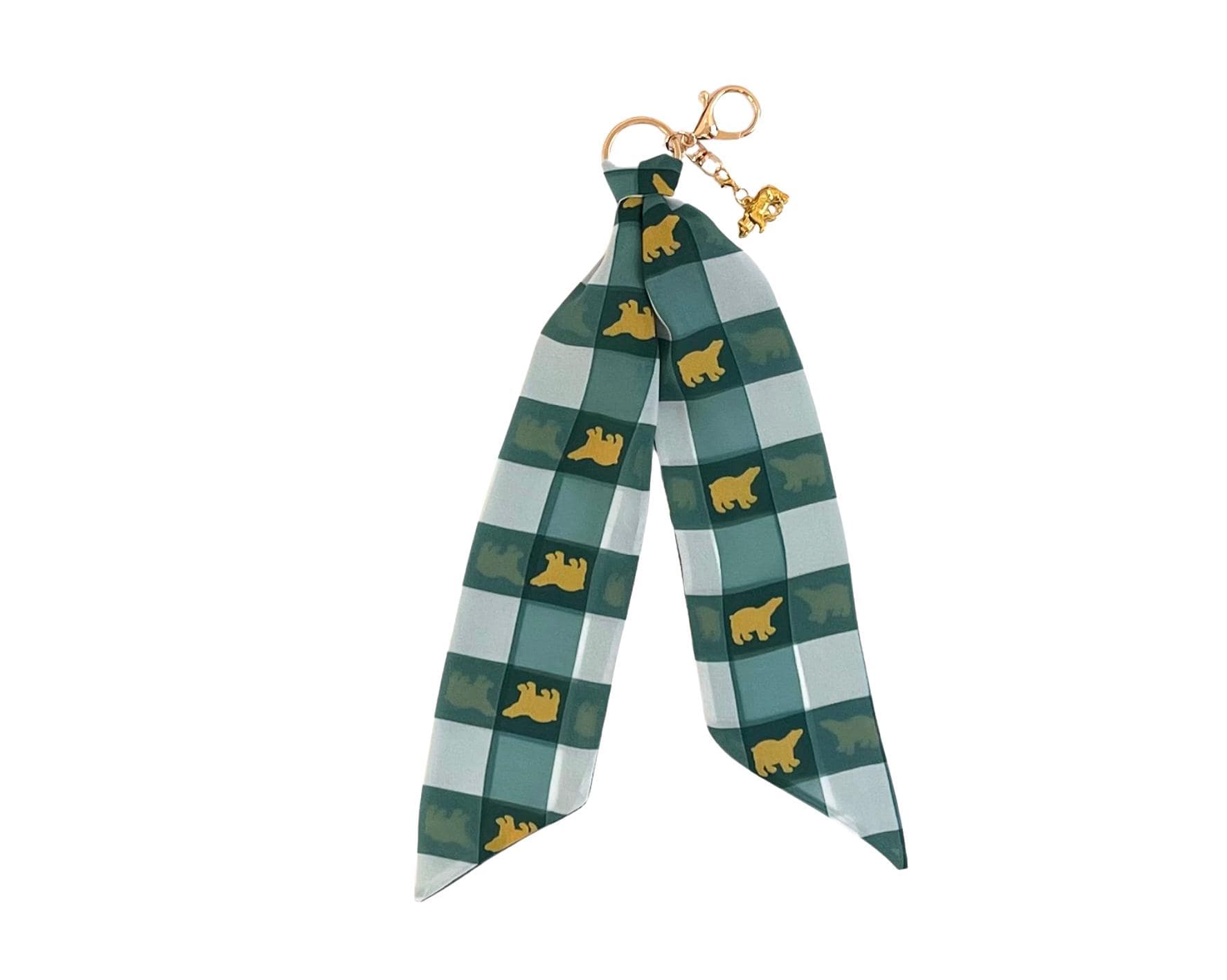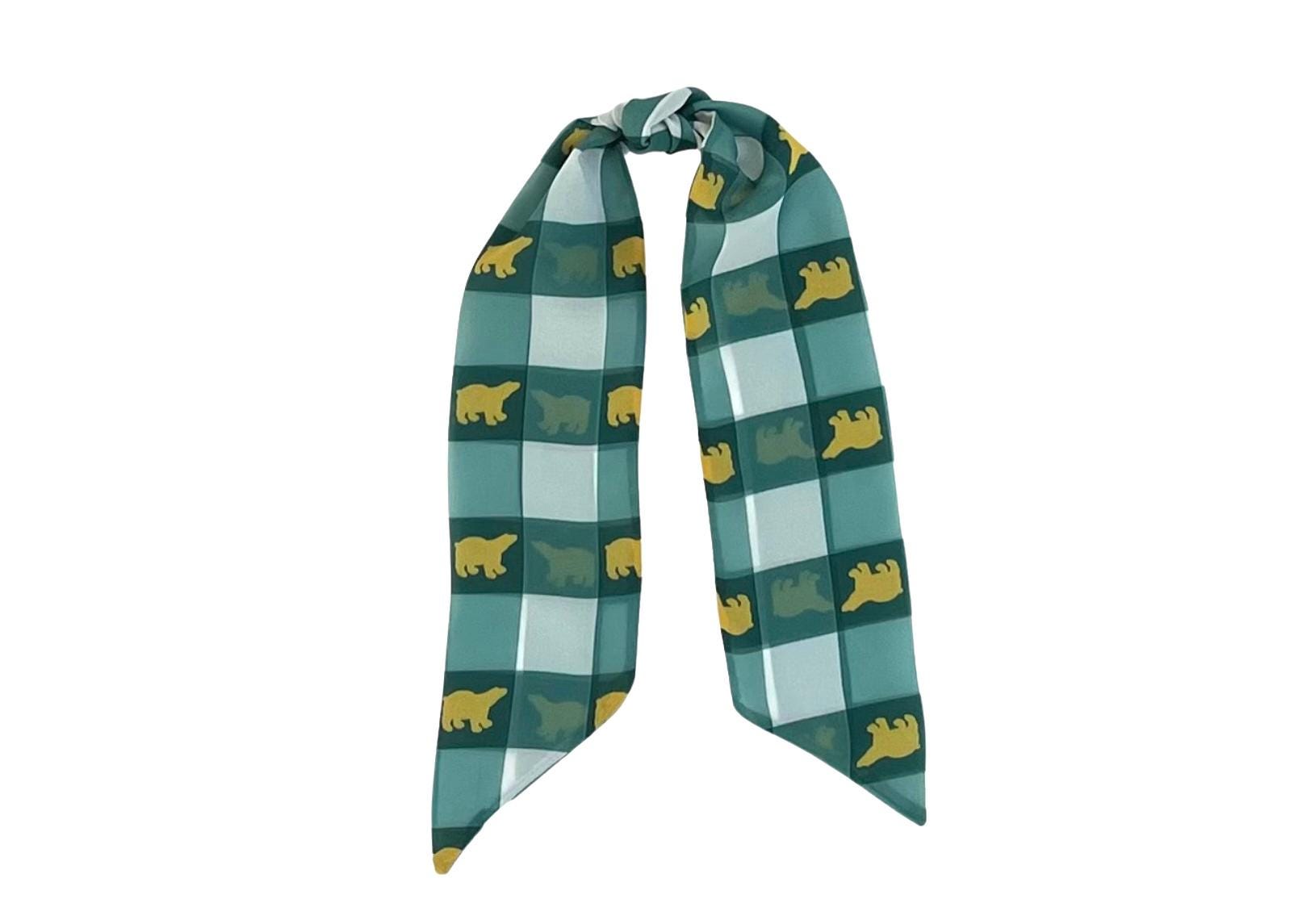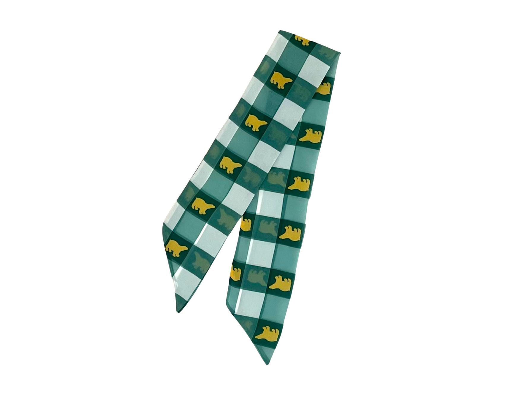 1) Checkered print with bear is made out of a lightweight, easy to tie chiffon fabric. The colors include green, gold and white.